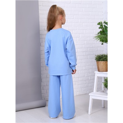Детский однотонный костюм для девочки из петельчатого футера. Подростковая толстовка со спущенной линией плеча, рукав длинный с манжетами, горловина кофты округлая. Удлиненные кюлоты имеют два кармана в боковых швах, брюки-трубы на резинке. Спортивный костюм прекрасно подойдет для прогулок, отдыха и дома, а также в качестве подарка.