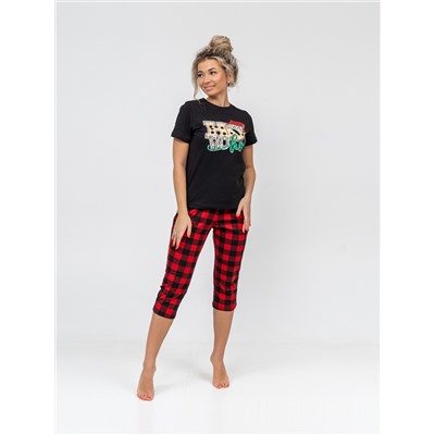 Новогодний костюм из 100% хлопка, уютный и мягкий. Базовая футболка с яркой новогодней печатью, поднимет Вам настроение. Классические бриджи на резинке с карманами будут идеальным вариантом для дома. Костюм отлично подойдет, как для повседневной носки в предновогодние дни, так и для тематической фотосессии.