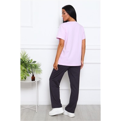 Костюм женский: брюки с удобными карманами в боковых швах, с комфортным поясом; футболка с короткими рукавами и стильным принтом с блёстками на полочке.