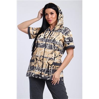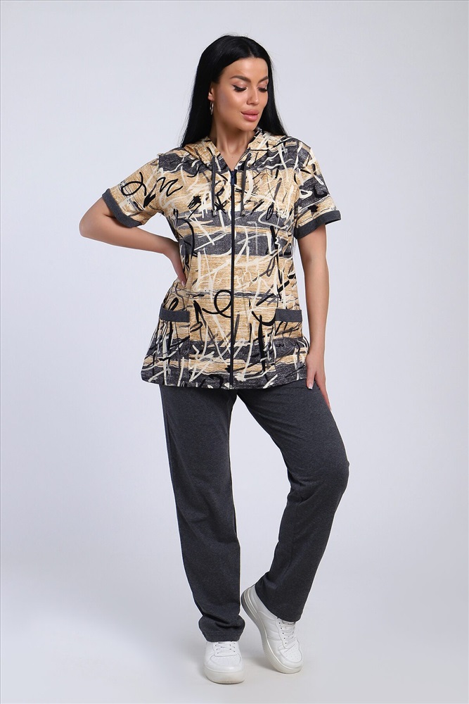 ID товара: 986668 Состав: Хлопок 100% Сезон: Весна/Лето Длина: Полная Фасон: Полуприлегающий Рукав: длинные Вид застежки: Молния Крой брючин: Прямой Рисунок: Абстракция Тип карманов: Накладные Декоративные элементы: С капюшоном Основная ткань: Хлопок Стиль: повседневный Вид ткани: Кулирка Страна бренда: Россия Страна производства: Россия Стильный женский костюм из легкой дышащей ткани. Сшит из мягкого трикотажного полотна высокого качества. Основной изюминкой костюма является сочетание абстрактного рисунка кофты и однотонного полотна брюк, в цвет основному тону изделия. Для вашего удобства кофта застегивается на молнию, что позволяет регулировать глубину горловины, вместо воротника имеется капюшон, объем которого регулируется тонкой лентой. Этот универсальный и практичный повседневный костюм в спортивном стиле будет удобным и комфортным во многих ситуациях. Комплект отлично подойдет для спорта, бега или танцев. Брюки свободные с яркими лампасами, двумя боковыми карманами, на широком поясе с резинкой. Каждую вещь вполне можно использовать по отдельности. Комплект отлично подойдет для женщин любого возраста и поможет хозяйке выглядеть стильно, при этом даря чувство комфорта! Комментарии к товару