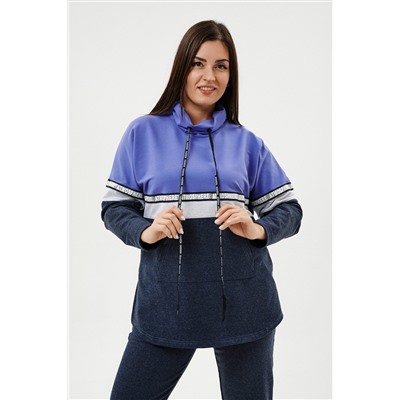 Костюм женский: толстовка и брюки. Туника прямого силуэта, брюки облегающие. Воротник стойка - хомут со шнурком. Карман - кенгуру. Верхняя и нижняя часть туники из разных тканей, посередине полочки и рукавов белая отделочная полоса с декоративной тесьмой. Брюки с внутренними карманами и лампасами из декоративной тесьмы.