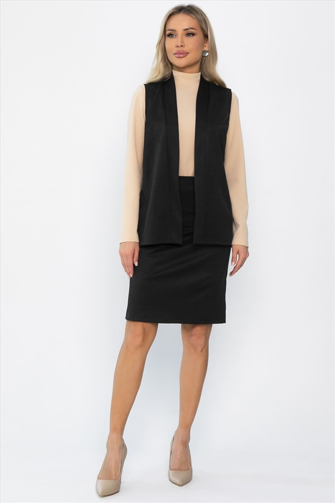 Костюм из классической юбки и жилета будет универсальным элементом вашего гардероба. Жилет с планкой по борту и с поясом. Юбка прямая, средней длины, с застёжкой на молнию, сзади разрез. Костюм подходит для ежедневной носки, а также может быть использован в офисной обстановке.