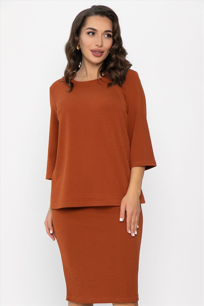 Комфортный и элегантный костюм на каждый день. Костюм состоит из джемпера и юбки карандаш. Юбка на резинке. Юбка-карандаш незаменима при создании делового образа. Компанию ей составляет свободная блузка с рукавом, который книзу расширяется.