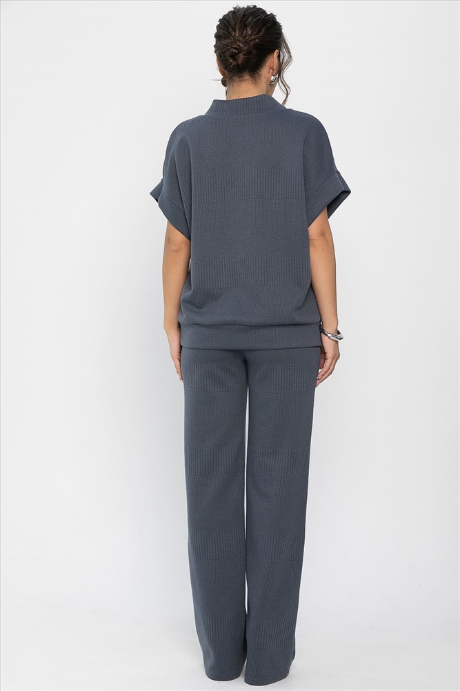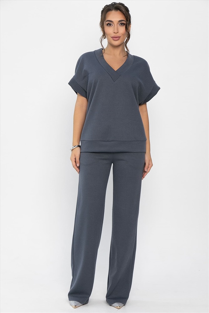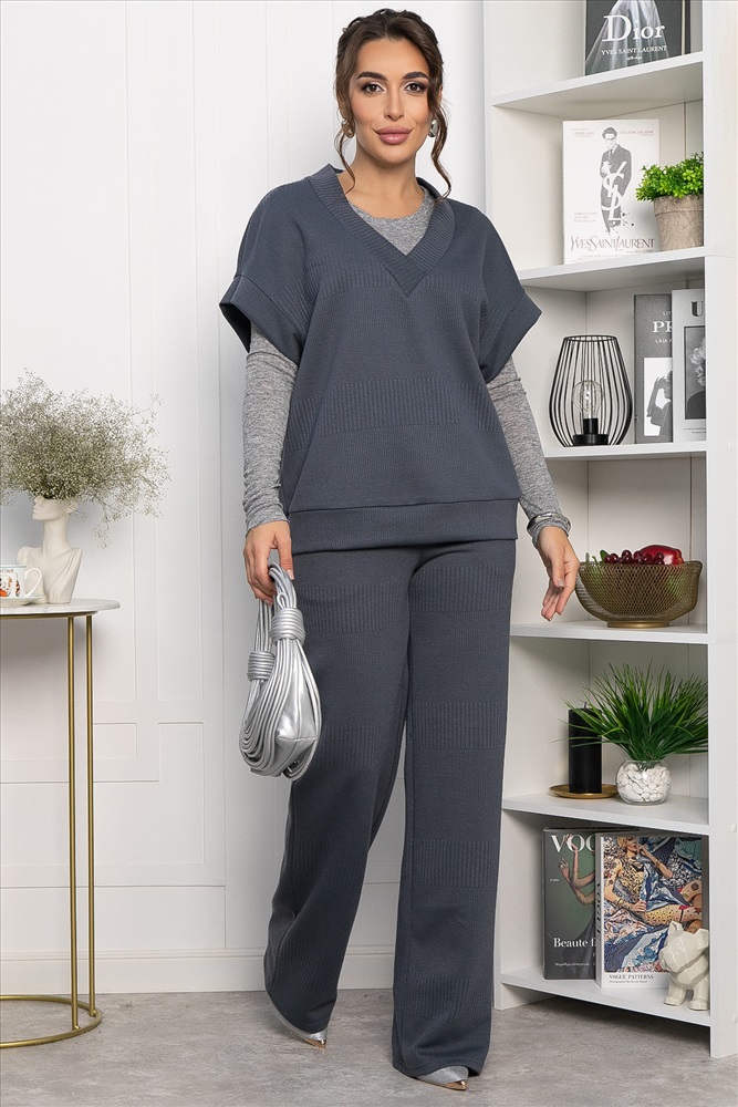 Костюм-двойка, состоящий из прямых брюк с высокой посадкой на резинке и жилета свободного кроя. Преимущество комплекта в том, что вы сможете самостоятельно носить как жакет, так и брюки. В повседневном образе смело сочетайте с лоферами или ботинками, а если нужен более официальный образ, с туфлями на каблуке.