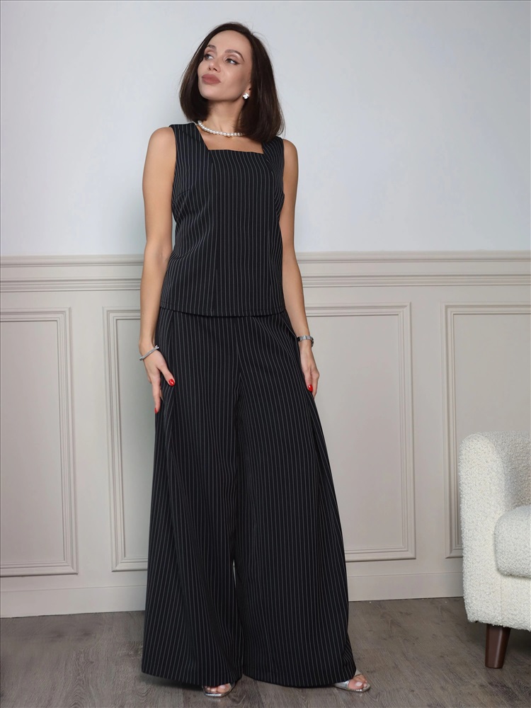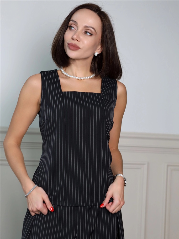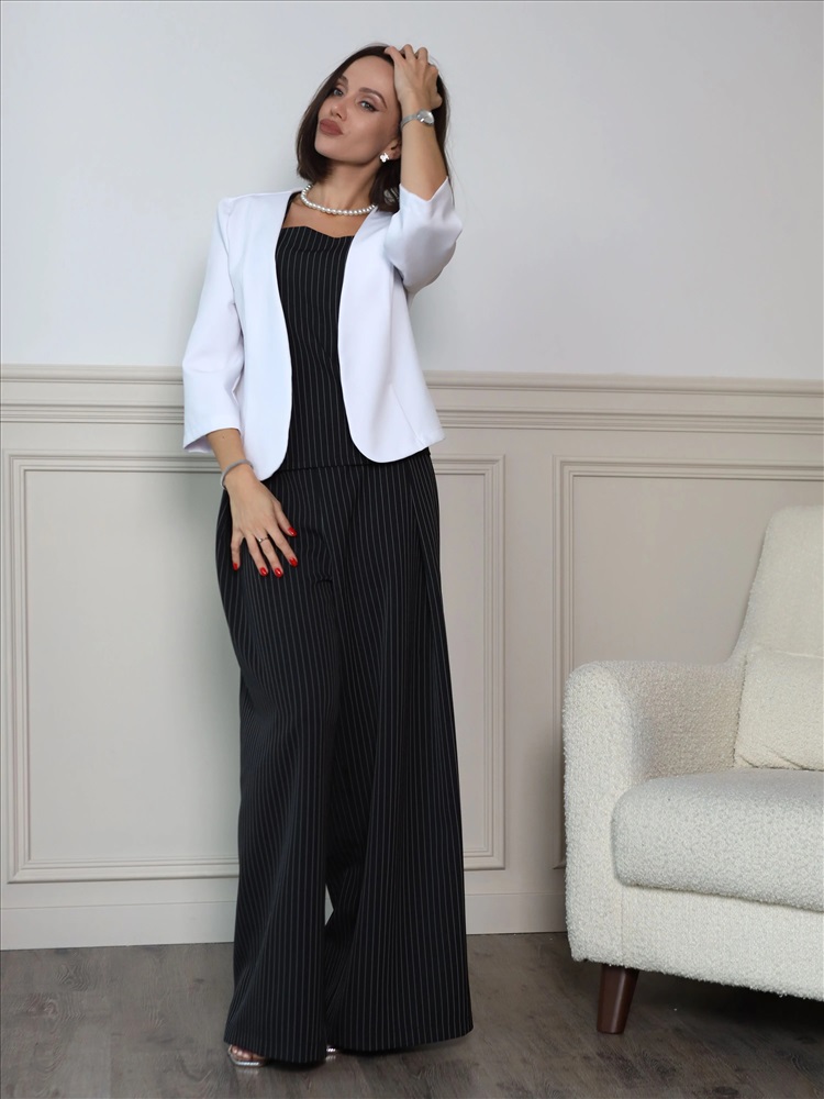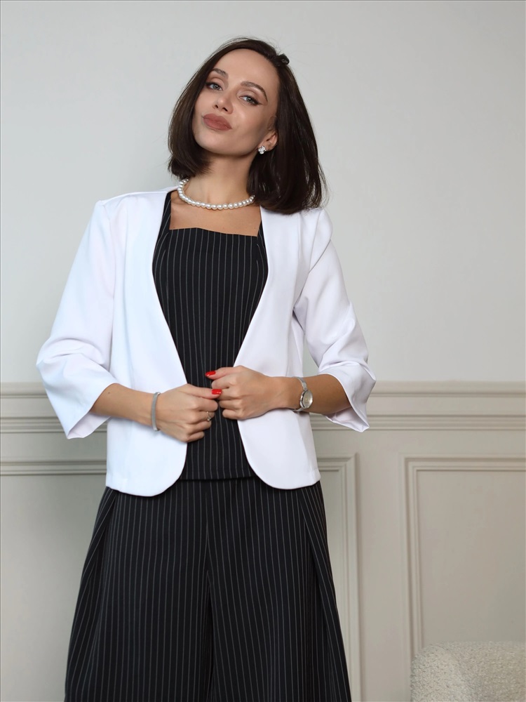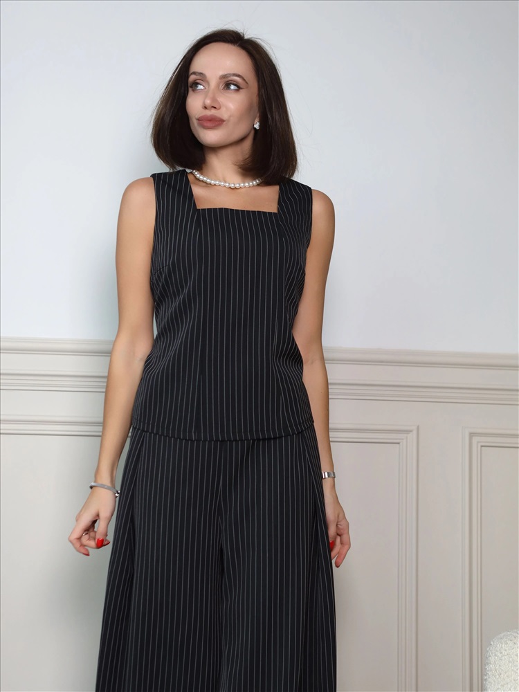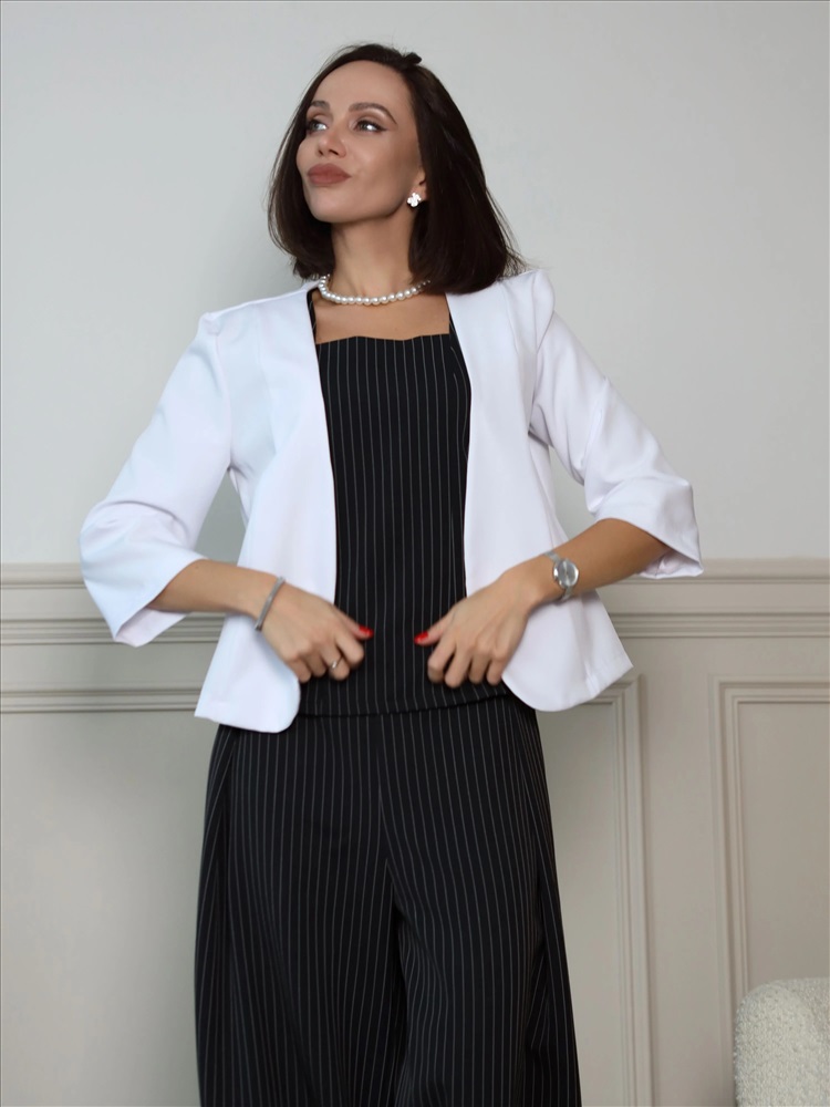 Состав, %: 100% полиэстер Вес: 0 ТипНоменклатуры: Товар Рост, см: 168 ВидНоменклатуры: Костюм Цвет: черно-белый Этот стильный костюм включает три элемента: белый жакет, жилет и черные брюки в полоску. Жакет с четким кроем и акцентированными плечами создает элегантную основу образа, а жилет добавляет структуре и завершает ансамбль. Брюки с тонкой полоской придают динамику и визуально удлиняют силуэт, делая образ современным и выразительным. Этот костюм станет идеальным выбором для тех, кто ценит стиль и комфорт в повседневной жизни. Жакет белый: рукава 3/4, без пуговиц, с манжетами, жилет на молнии сбоку, вырез каре, брюки палаццо на молнии сбоку, карманы в шве Комментарии к товару