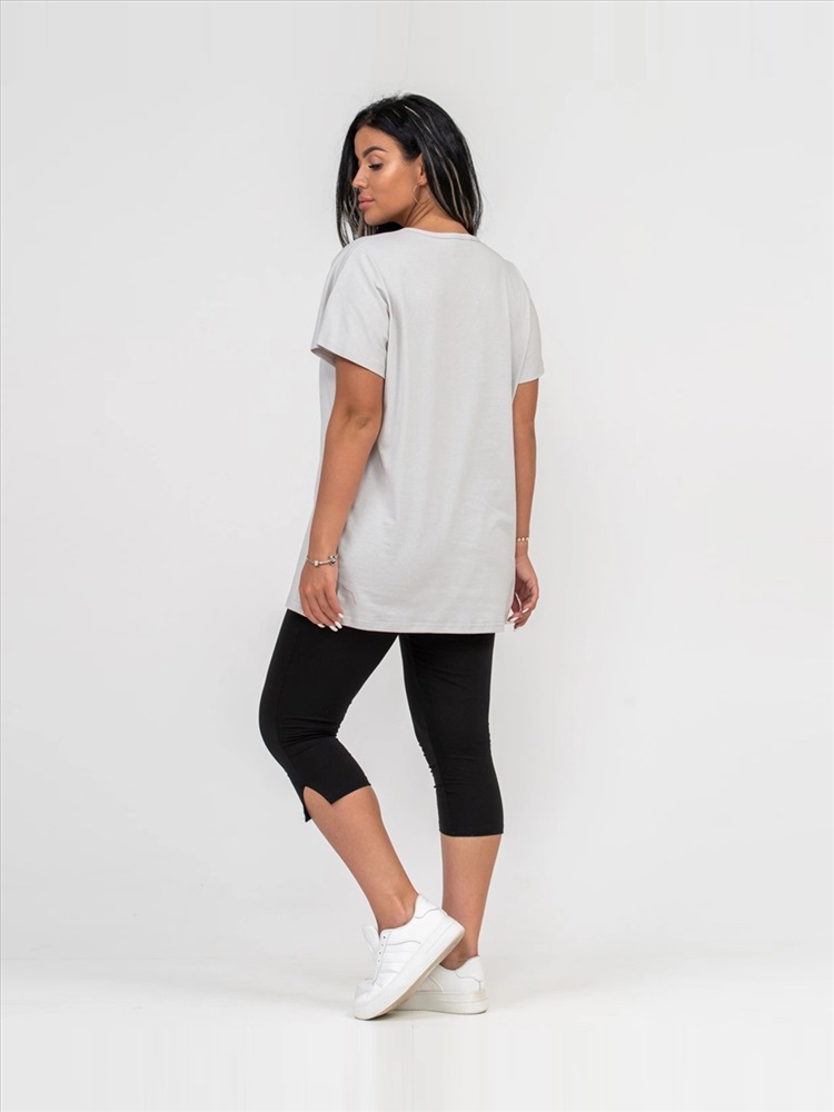 Состав: хлопок 100% Цвет: серый / черный Декоративные элементы: принт Костюм женский из трикотажного полотна, состоящий из бридж и футболки. Футболка полуприлегающего силуэта длинной чуть ниже уровня бёдер. Вырез горловины О-образный. Бриджи из однотонного трикотажного полотна длинной ниже уровня колена. Комментарии к товару