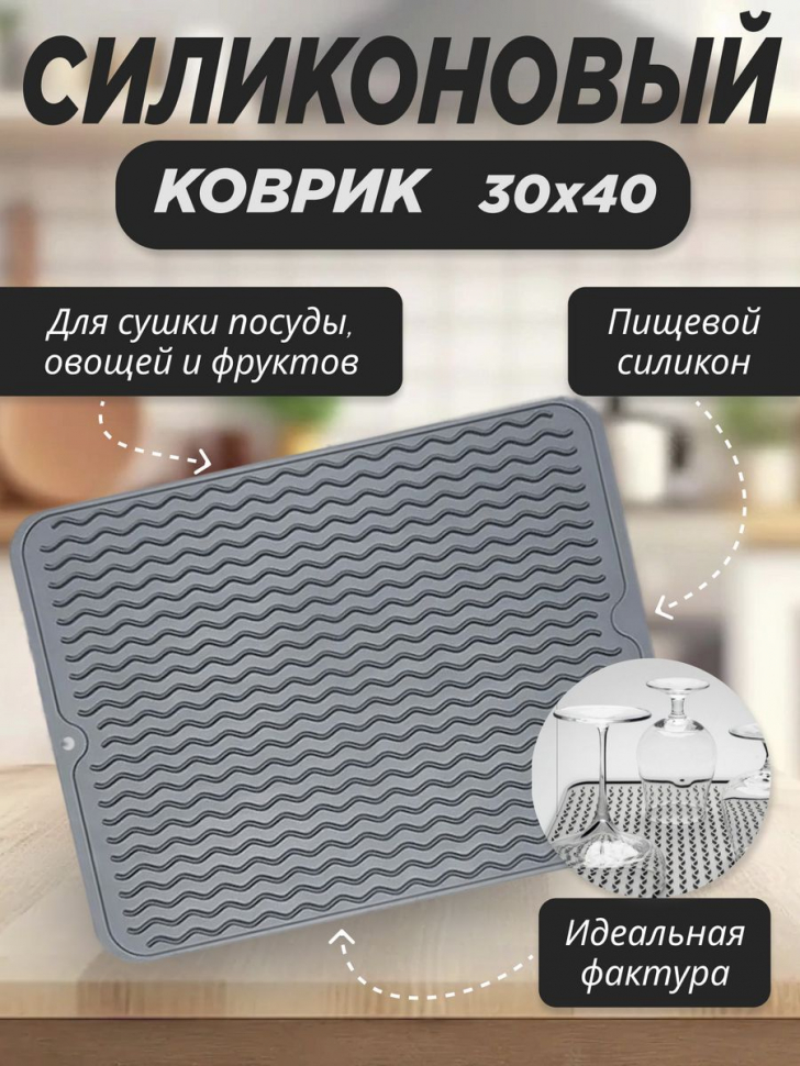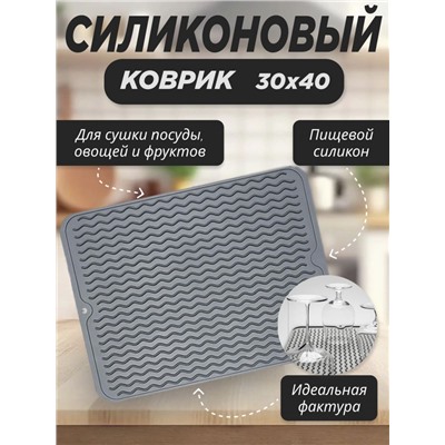 Коврик для сушки посуды, а так же фруктов и овощей. Необходимая вещь на кухне для каждой хозяйки. Цвет серый. Коврик ребристый, рельефный, силиконовый. Мягкая поверхность защищает посуду от сколов. Вода свободно стекает в желоба, а после ее легко стряхнуть в мойку. Бортики по краям защищают стол от намокания.