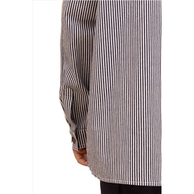 Куртка - джинсовка из плотной диагональки в полоску, спущенное плечо, длинные рукава с притачными манжетами на кнопках, воротник на стойке, застежка на кнопки, на левой полочке карман с нашивкой.