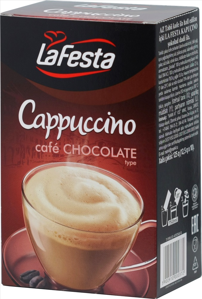 Растворимый напиток с добавлением натурального растворимого кофе. Вкус: шоколадный.Насыщенный аромат кофе и яркий шоколадный вкус для любителей необычных напитков. Удобные порционные пакетики идеальны для того, чтобы взять любимый напиток с собой на работу, учебу или в путешествие.С La Festa утро вкуснее!