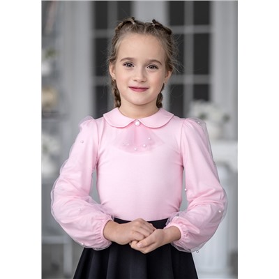 Модель блузки для младшей возрастной группы. Блузка из трикотажного полотна с отделкой из сетки с жемчугом. Застёжка сзади на спине под воротником на воздушную петлю-пуговицу, с разрезом. Воротник отложной округлой формы. Разрез застёжки и горловина обработаны внутренними обтачками с изнанки изделия. Рукав двухслойный,верхний слой из сетки с жемчугом. Окат и низ рукава со сборкой. Рукав на запястье фиксируется окантовкой. Блузка с жабо из сетки в тон основной ткани. Жабо по центру оформлено отделочной перламутровой пуговицей. (жабо пристёгивается на потайные пуговички под воротником). Комментарии к товару