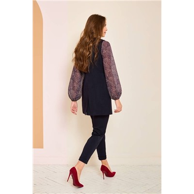 Комплект женский двухпредметный: жилет, брюки. Удлиненный жилет полуприлегающего силуэта, с отложным воротником и лацканами, застежка на 2 пуговицы. Впереди рельефы от проймы., внутренние карманы «в рамочку» + клапаны (которые можно спрятать). По спинке центральный шов и рельефы. Жилет на подкладке «Гранд». Брюки слегка укорочены и заужены к низу, с отворотом в виде манжеты, при желании отворот можно убрать и брюки удлинить. Брюки оформлены притачным поясом, застежка «молния» + пуговица, у боковых швов – внутренние карманы, сзади имитация карманов виде рамочек. Длина жилета сзади по спинке 84 см. Длина брюк по боковому шву 96 см.