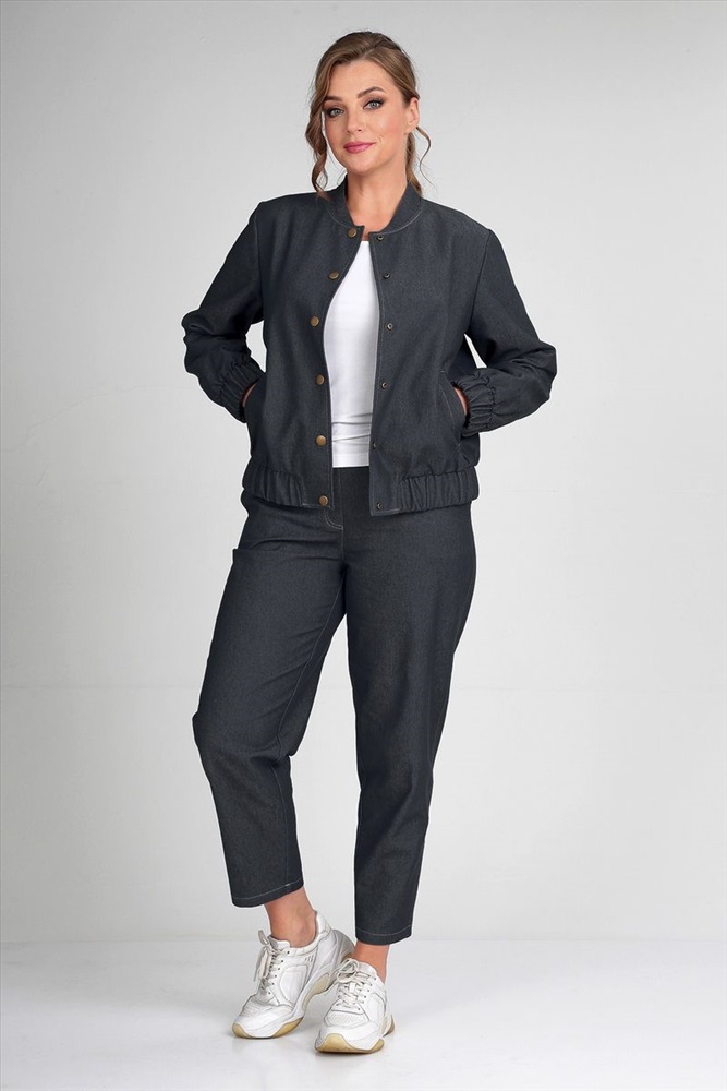 Комплект выполнен из хлопкового джинса. Куртка на подкладке. Центральная застежка на кнопки. По переду наклонные карманы с листочкой в области талии. Спинка цельная. По низу куртки притачной пояс с резинкой, воротник стойка. Рукава втачные одно-шовные, по низу на манжете с широкой резинкой. Брюки на притачном поясе, от середины передних половинок и по спинке на резинке, заужены к низу. Застежка брюк спереди по типу «гульфик». По бокам карманы с наклонным входом. Сзади накладные карманы.