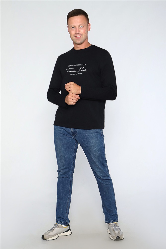 Лонгслив мужской с округлой горловиной, обработанной усилителем. Широкая футболка с длинными рукавами имеет свободный крой и классическую, не спущенную линию плеча.