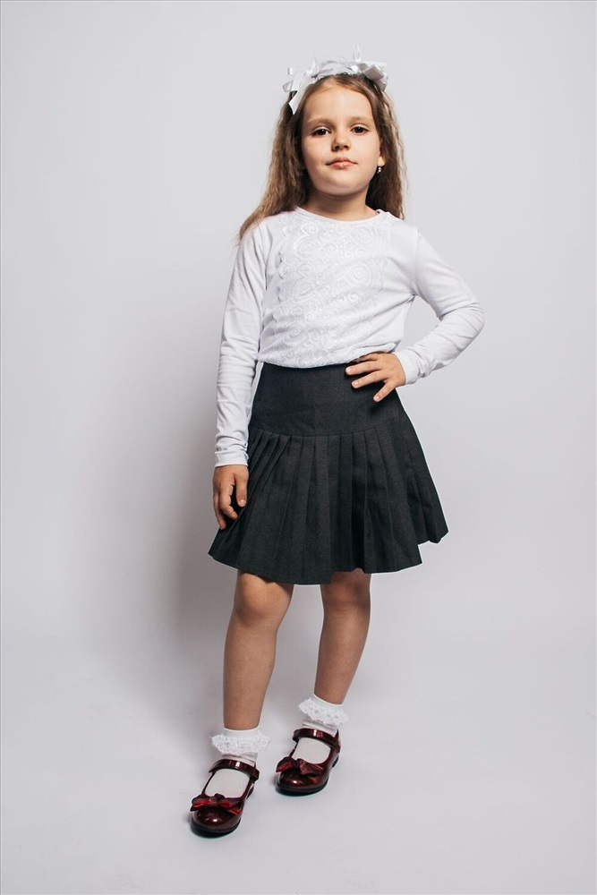 Блузка с длинным рукавом из мягкого хлопкового полотна с эластаном декорирована гипюровой тесьмой в цвет изделия.