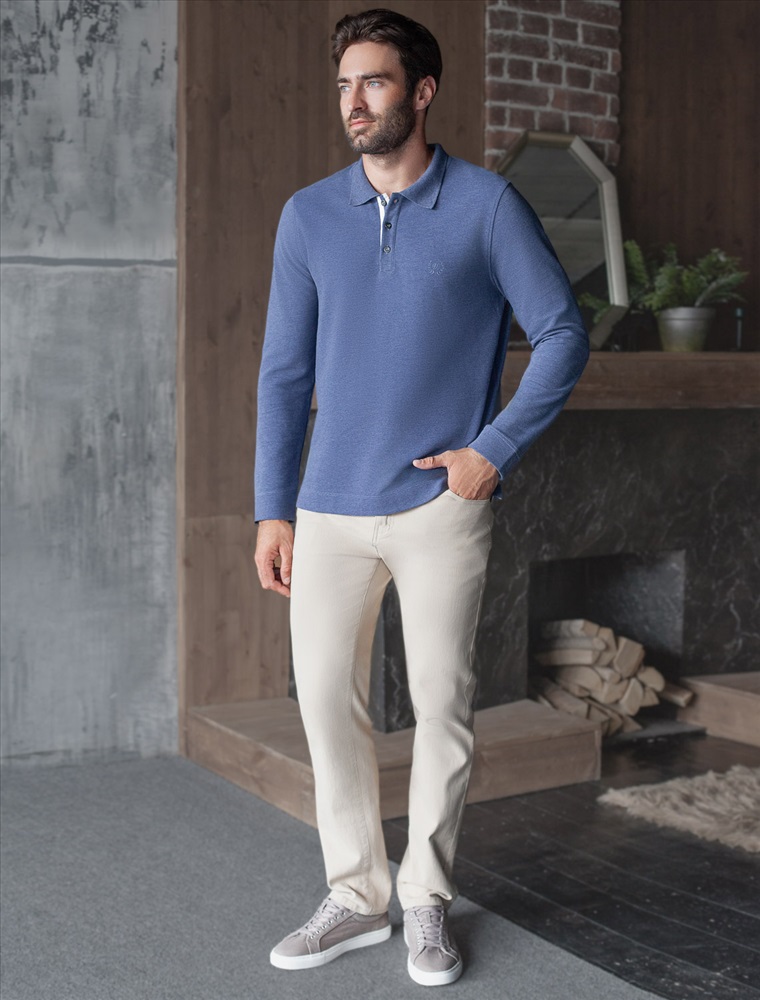 Плотность: 300 Г/м2 Стильный лонгслив синего цвета с эффектом меланж с плетеным воротником поло с застежкой на металлические пуговицы выполнен из премиального хлопка в сочетании с эластаном . Невероятно мягкая ткань из натуральных волокон - она едва ощутима на коже и словно обнимает тело. Материал при касании кажется бархатистым, при движении он словно повторяет все мельчайшие линии фигуры. По свойствам материал сочетает в себе практичность и нежность: отлично пропускает воздух, сохраняя ощущение свежести в течение всего дня, при этом в нем тепло в прохладную погоду.Идеально подходит для чувствительной кожи, не вызывает раздражения и дискомфорта. Удобный отложной воротник с контрастной отделкой делает образ современным и стильным, а длинные рукава с манжетами защищают руки при ветреной погоде. Поло хорошо садится по фигуре благодаря добавлению эластичных волокон — такой вариант подходит для мужчин любого роста и размеров, не стесняет движений и создает ощущение свободы и легкости. Лонгслив с пуговицами дополнен ненавязчивой вышивкой на груди в виде логотипа бренда в тон основному цвету, которая придает образу индивидуальность, не перегружая его лишними акцентами. Лаконичная вышивка служит оригинальным декоративным элементом, гармонично вписываясь в общий минималистичный облик. Такой подход делает лонг универсальным решением для тех, кто ценит простоту и стремится подчеркнуть свой вкус через детали. Легкий джемпер идеально комбинируется как с классическими брюками, так и с джинсами или шортами — универсальность этой модели оценит каждый мужчина, предпочитающий удобную одежду для активного дня. Легкий и дышащий материал делает повседневный лонгслив практичным для ношения в переменчивую осеннюю погоду, когда температура еще не слишком низкая, но уже ощущается прохлада. Комментарии к товару