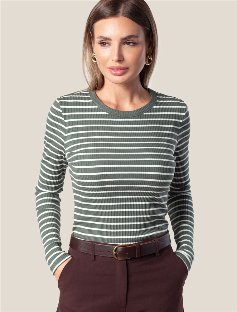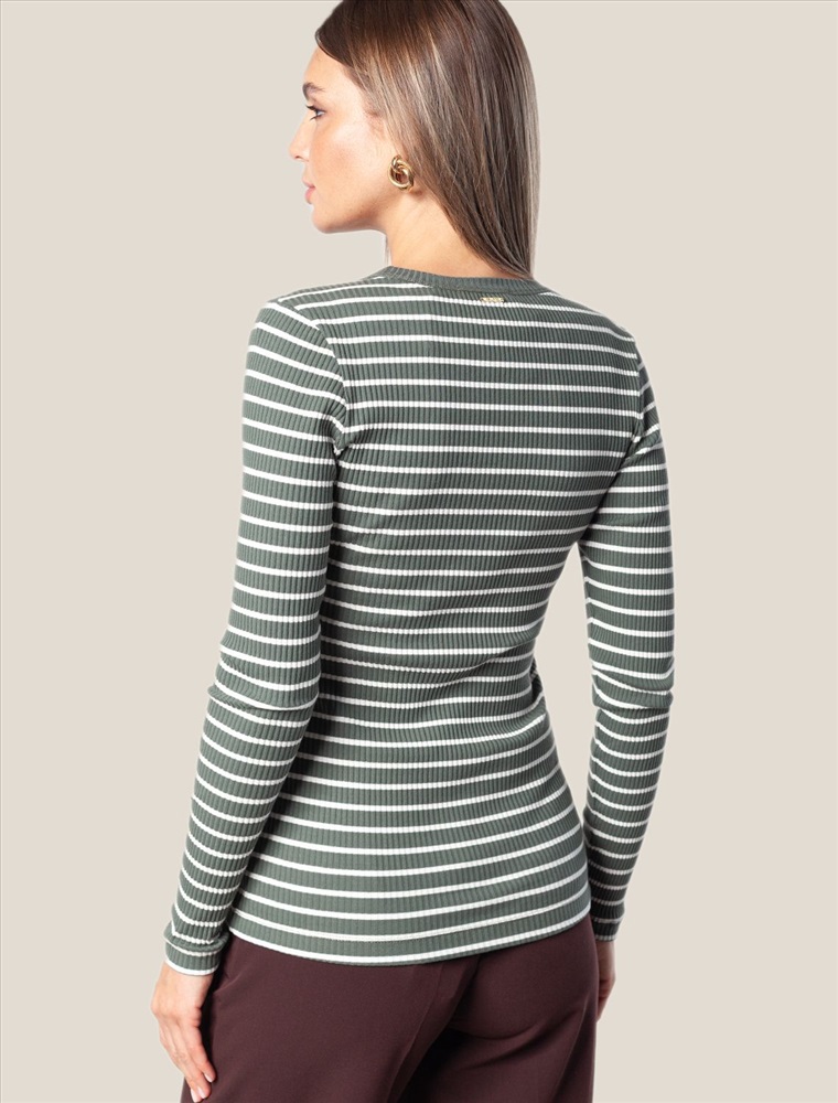 Параметры модели на первом фото: Рост 170, бюст 89, талия 63, бедра 92 Лонгслив с узким рукавом выполнен из трикотажа в широкий рубчик. Мягкий и эластичный трикотаж безупречно держит форму и комфортно сидит по фигуре, не сковывая движения. Модель дополнена металлическим логотипом бренда.