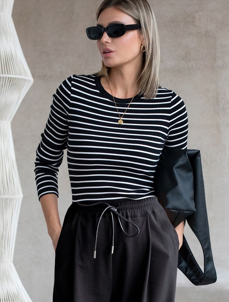 Параметры модели на первом фото: Рост 170, бюст 89, талия 63, бедра 92 Лонгслив с узким рукавом выполнен из трикотажа в широкий рубчик. Мягкий и эластичный трикотаж безупречно держит форму и комфортно сидит по фигуре, не сковывая движения. Модель дополнена металлическим логотипом бренда. Комментарии к товару
