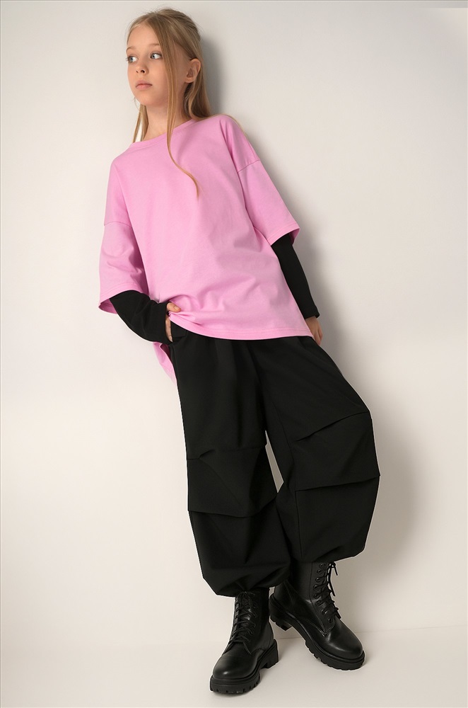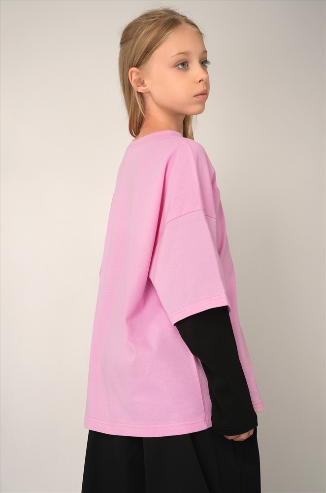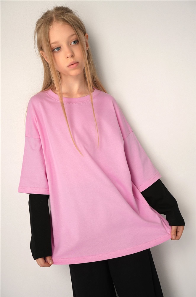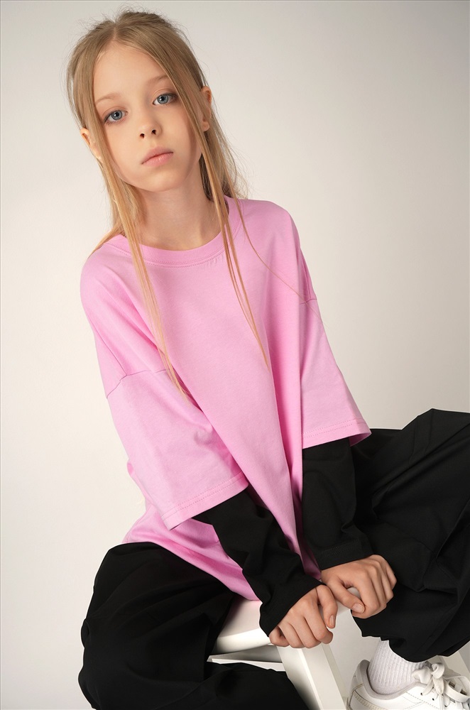 Ультрасовременный и свободный — этот детский лонгслив для девочки подростка точно не останется без внимания. Комбинированная расцветка и эффект двойного рукава добавляют образу яркий акцент и лёгкую дерзость.