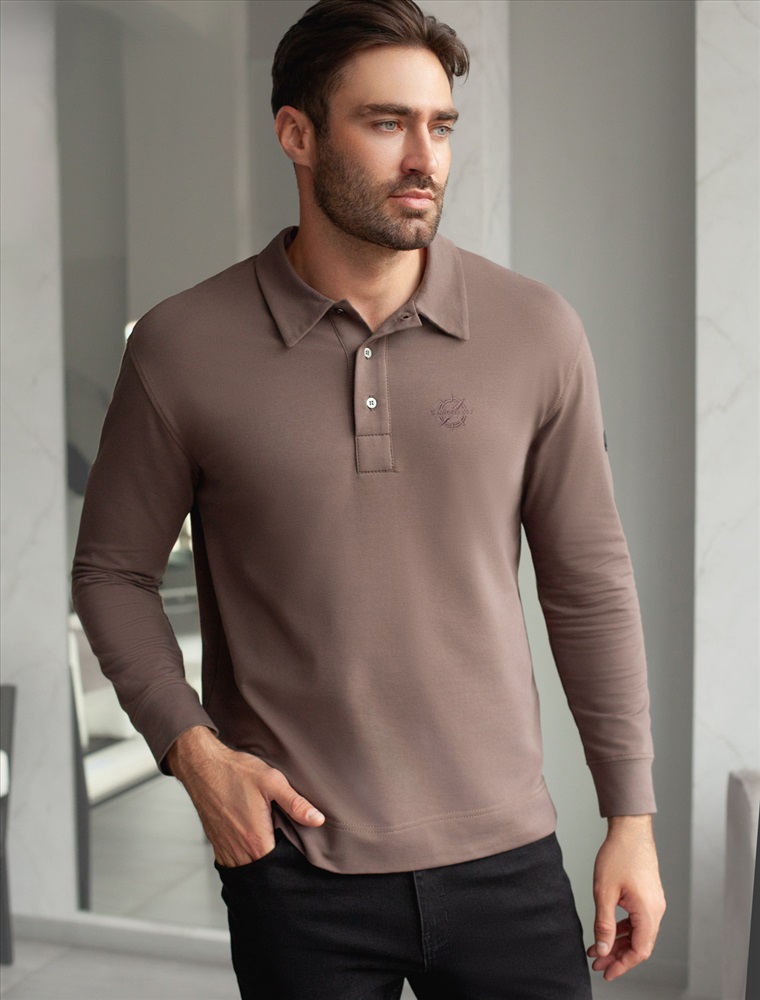 Стильный лонгслив кофейного цвета с воротником поло выполнен из премиального хлопка в сочетании с эластаном . Натуральная ткань обеспечивает легкость, воздухопроницаемость и приятные тактильные ощущения даже когда жарко, позволяет не перегреваться и поддерживает комфортный микроклимат в течение всего дня. Удобный отложной воротник на аккуратных пуговицах делает образ современным и стильным, а длинный рукав защищает руки при ветреной погоде. Поло хорошо садится по фигуре благодаря добавлению эластичных волокон — такой вариант подходит для мужчин любого роста и размеров, не стесняет движений и создает ощущение свободы и легкости.