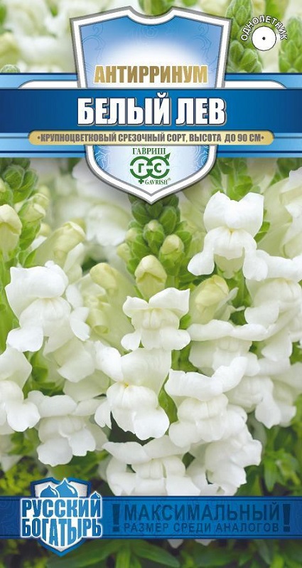 Великолепный крупноцветковый срезочный сорт. Декоративное растение из семейства Норичниковые, культивируемое как однолетник, высотой 70-90 см. Цветет с конца июня до поздних заморозков. Цветки собраны в кистевидные соцветия белой окраски. Холодостоек, светолюбив, к почвам нетребователен, в засушливый период нуждается в поливе. Выращивают рассадным способом. Для получения дружных всходов семена необходимо стратифицировать при температуре +10оС. Посев проводят с начала марта до середины апреля, поверхностно, не заделывая, в ящики с субстратом и ставят на свет. Всходы появляются через 8-12 дней. Рассаду высаживают во второй половине мая с расстоянием между растениями 35-40 см. Используется для групповых посадок и цветников, а также для получения высококачественной срезки (львиный зев стоит в воде до двух недель). Фасовка 0,05 Комментарии к товару