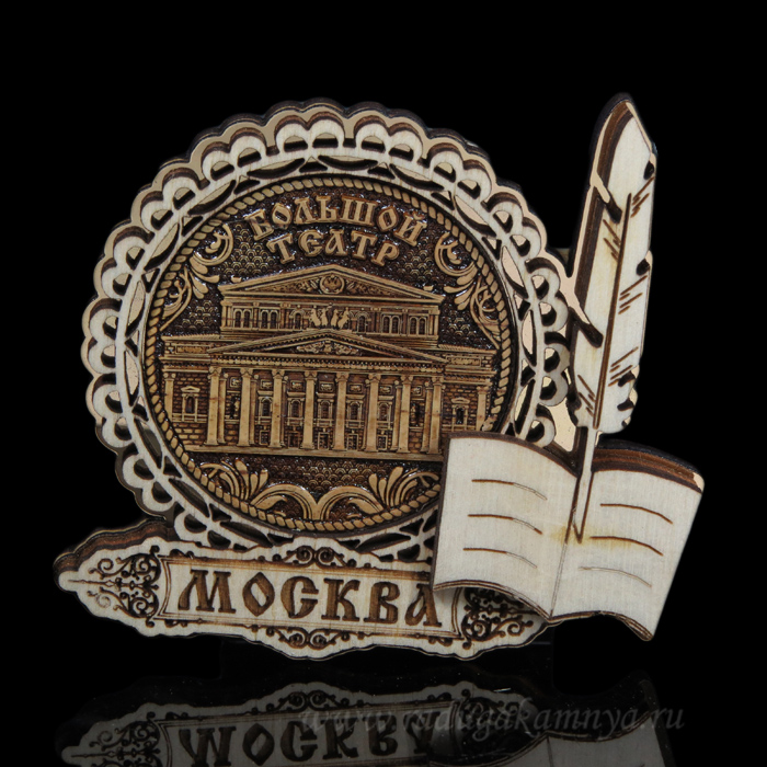 Магнит из бересты г. Москва "Большой Театр" с пером 90*77мм вставка золотистая
