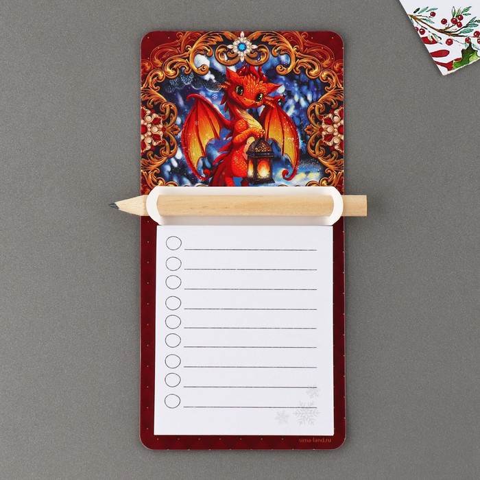 Полимерный магнит на холодильник с блоком для записей и карандашом - нужный и практичный предмет, без которого просто не обойтись на работе и дома! Новогодний магнит со стикерами имеет размер 8 х 14 см. Такой новогодний сувенир станет отличным подарком близкому человеку на Новый год.