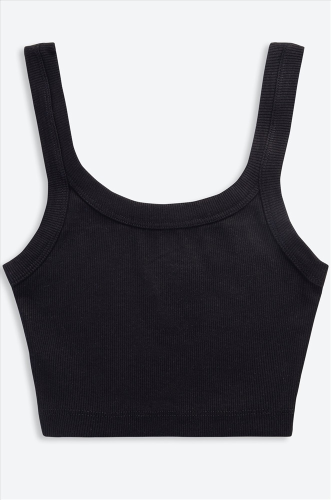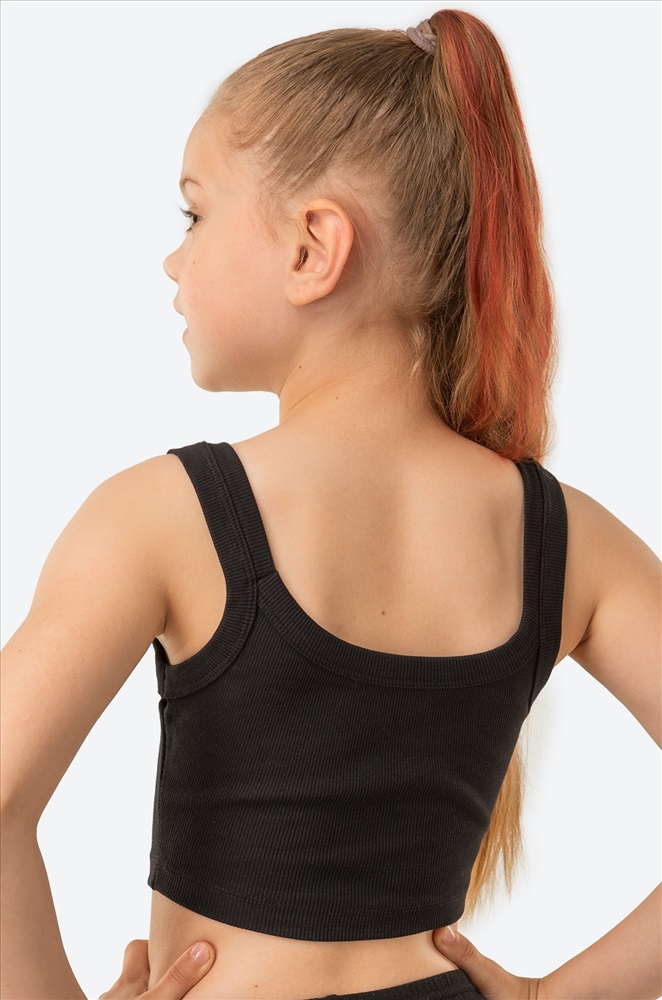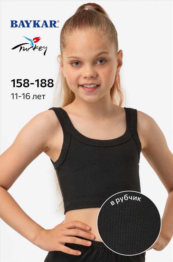 Детская майка-топ в рубчик для девочек и девочек-подростков выполнены из нежного гипоаллергенного хлопка. Благодаря фактурной ткани лапша топик на широких бретелях отлично тянется и дарит свободу движений. Укороченная маечка представлена в базовом черном цвете.