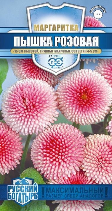 Маргаритка неприхотливое многолетнее растение, культивируемое как двулетнее. Имеет крупные, плотные как помпоны, махровые соцветия, диаметром 4-5 см. Кусты прочные пышные, одинакового размера, высотой 15 см, в пору цветения, обильно усыпаны ярко-розовыми соцветиями. Используется в профессиональном и любительском садоводстве для выращивания на клумбах, рабатках, в бордюрах, а также в горшках и балконных ящиках. Предпочитает солнечные места без застоя воды. Хорошо переносит легкое затенение. Недостаток влаги в период цветения может привести к измельчению и полному исчезновению соцветий. Семена высевают в открытый грунт в конце июня-начале июля, поверхностно, не заделывая. Всходы появляются через 7-10 дней. Цветение начинается в апреле на второй год после посева. При хорошем уходе растение цветет до осени, с перерывом в жаркий период сезона. Фасовка 5шт Комментарии к товару