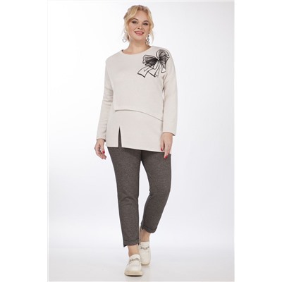 Комплект женский 2-х предметный ,состоящий из блузки и брюк. Блузка из трикотажной ткани с подрезом по переду и спинке. По переду выполнен разрез и печать. Рукав рубашечный со спущенной линией плеча. Горловина круглая. Брюки прямые,слегка заужены к низу. По низу на передних половинках брюк выполнен подгиб низа. Пояс на резинке. Длина блузки по спинке 75 см, длина рукава 61, длина брюк 102 см.