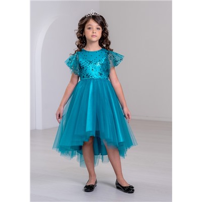 Платье из однотонной атласной ткани, комбинированное с верхним слоем сетки-пайетки по переду лифа и двухслойной юбкой из сетки и рукавом-крылом. Верхнее полотно переда лифа из сетки расшито пайеткой в виде рисунка-«чешуек». Горловина платья обработана атласным кантом. Спинка лифа из атласной ткани. Крылья платья двухслойные, состоящие из двух цветов сетки, используемые так же на юбке. Крой крыла с конической разводкой формирует мягкие спадающие фалды. Платье с асимметричной линией низа юбки. Двухслойная юбка из сетки имеет два разных оттенка и собирается на линии талии в виде декоративной сборки. Платье отрезное по линии талии с застёжкой на молнию от горловины по среднему шву спинки. Верхняя двухслойная юбка«солнце», с боковыми швами, и со сборкой по талии. Линия низа верхней юбки с перепадом длины (по переднему полотнищу-короче). Нижняя атласная юбка конического кроя, с боковыми швами (короче верхней юбки и без перепада длины по линии низа). Платье на хлопковом подкладе без внутренних юбок из сетки.