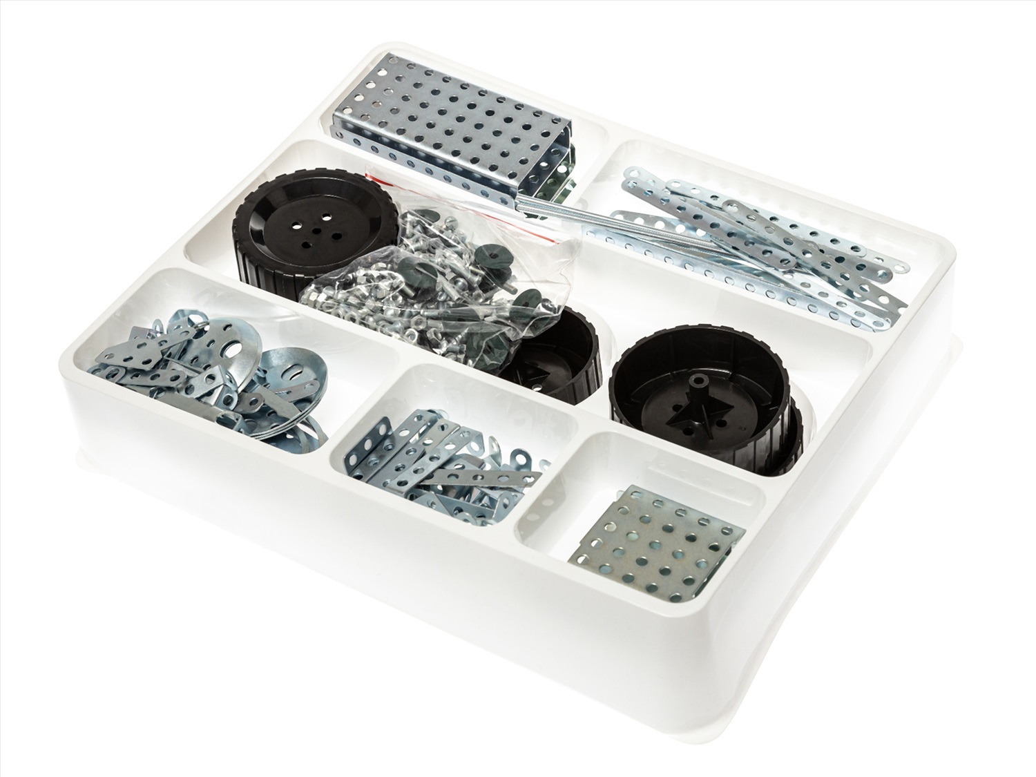 • Планка 10 отверстий – 12 шт. (согнуть при сборке) • Планка 5 отверстий – 4 шт. • Планка 3 отверстия – 6 шт. • Косынка II – 4 шт. • Косынка III – 2 шт. • Скоба малая – 1 шт. • Скоба I – 6 шт. • Скоба II – 12 шт. • Пластина 50х20 – 3 шт. • Уголок I – 20 шт. • Уголок II – 4 шт. • Уголок III – 2 шт. • Панель большая – 6 шт. • Панель – 2 шт. • Шпилька L75 M4 – 3 шт. • Ось L=140 M4 – 2 шт. • Планка сегментная II – 4 шт. • Колесо (руль) – 1 шт. • Шкив – 14 шт. • Диск большой – 5 шт. • Колесо большое – 5 шт. • Винт М4 х 6 – 103 шт • Винт М4 х 8 – 20 шт. • Винт М4 х 16 – 9 шт. • Винт М4 х 35 – 1 шт. • Гайка М4 – 145 шт. • Отвёртка – 1 шт. • Гаечный ключ – 1 шт. • Инструкция со схемой сборки – 1 шт.
