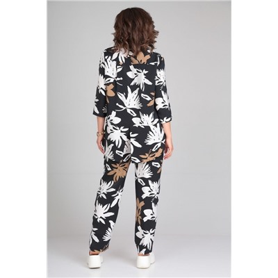 Блуза свободного силуэта с модным принтом. По переду центральная застежка на петли-пуговицы. По спинке отрезная кокетка, от которой заложена складка для свободы движения. В нижней части спинки горизонтальный подрез с разрезом по середине. Низ блузы фигурной формы. Горловина оформлена рубашечным воротником со стойкой. Рукав втачной, одношовный, длиной ¾.