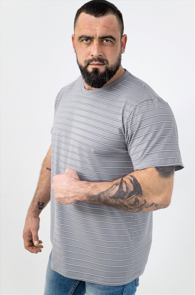 Преимущества: – трикотажная ткань с гладкой поверхностью; – прямой крой и круглый ворот; – актуальная полоска; – есть большие размеры. Серая футболка в полоску подходит для мужчин, ценящих удобство и простоту. Хлопковая основа и шелковистая структура трикотажа дарят комфорт и аккуратный внешний вид. Рост модели 186 см, параметры 120-96-106 см. На нем футболка 60 размера. Комментарии к товару