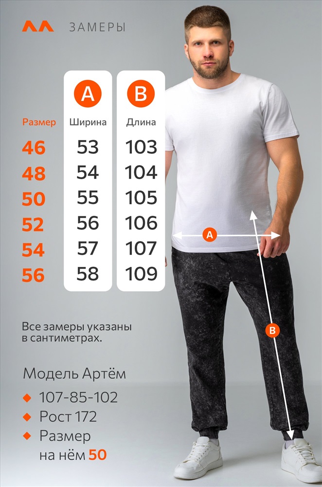 Модель Артем, рост 172 см, параметры 107-85-102 см. На нем размер 50.