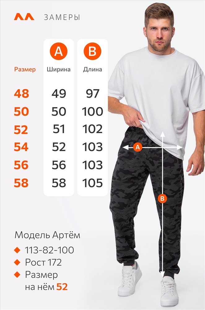 Модель Артем, рост 172 см, параметры 113-82-100 см. На нем брюки размера 52.
