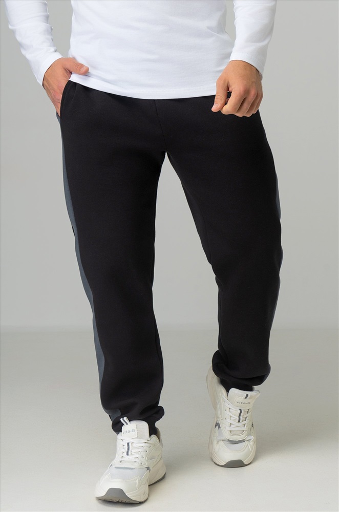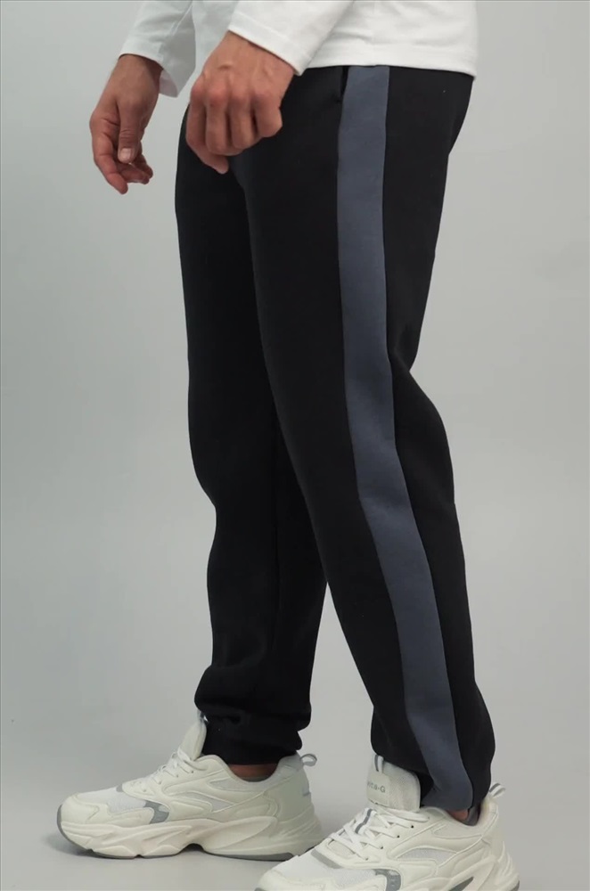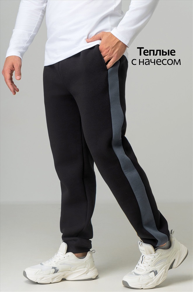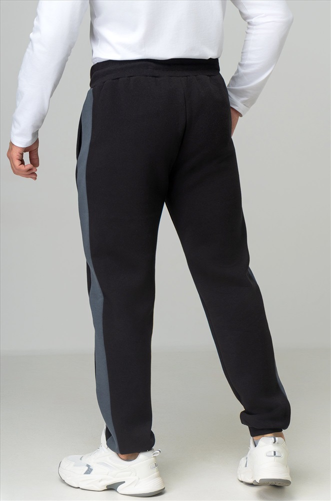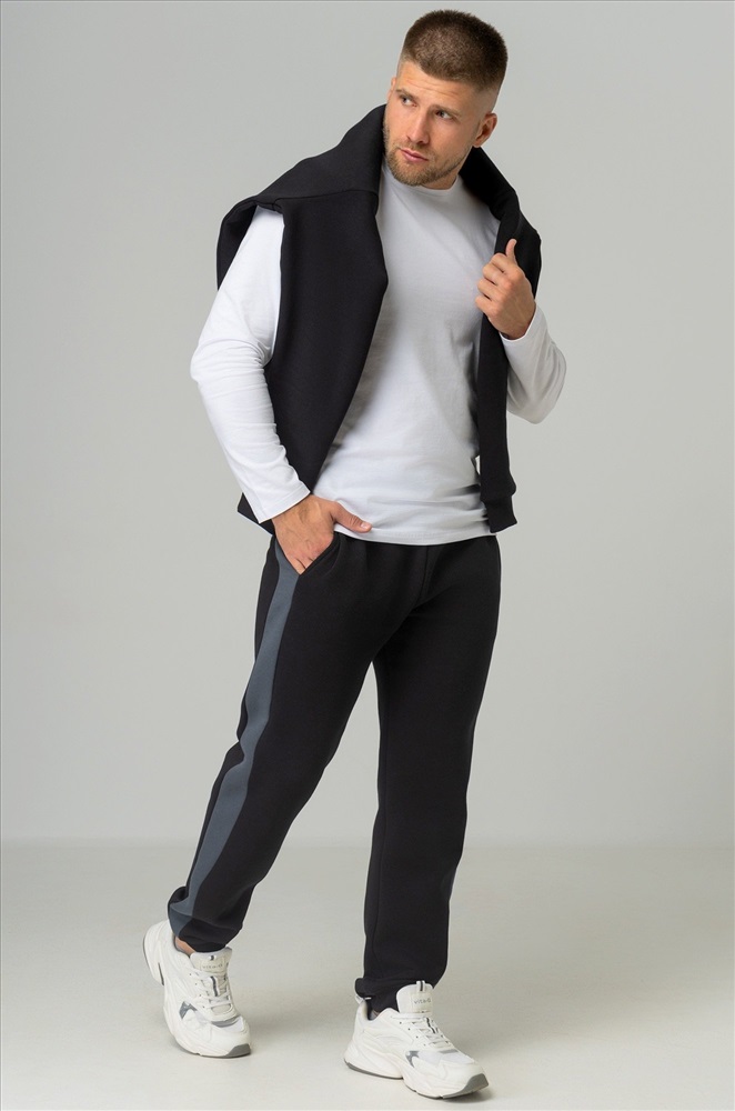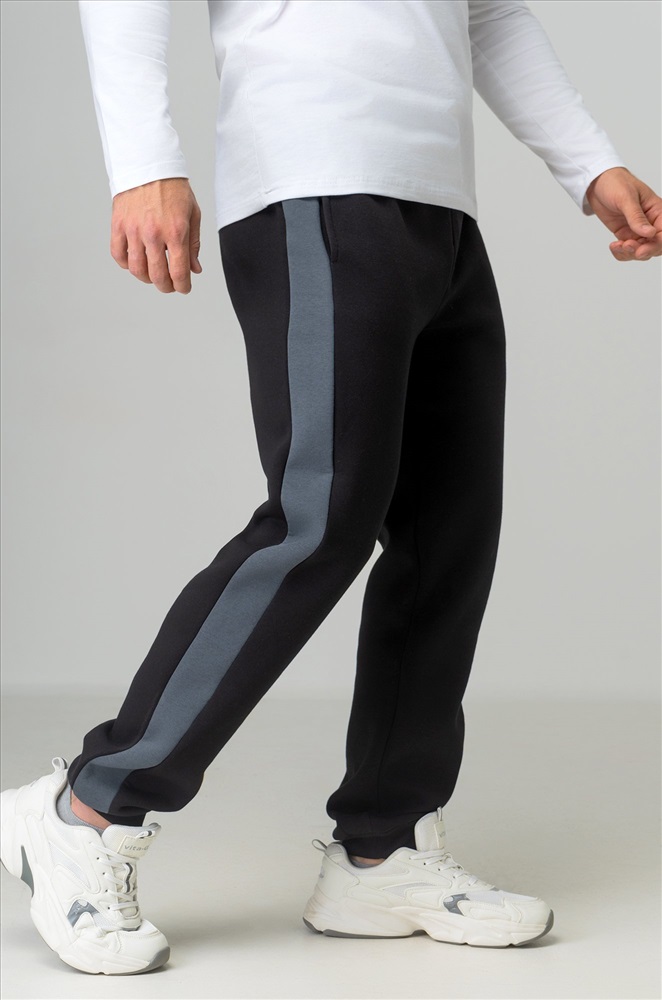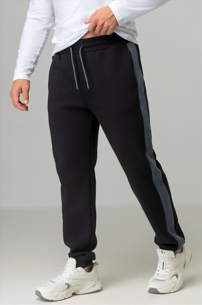 — черные штаны с серыми вставками легко вписываются в уличный стиль и кэжуал.