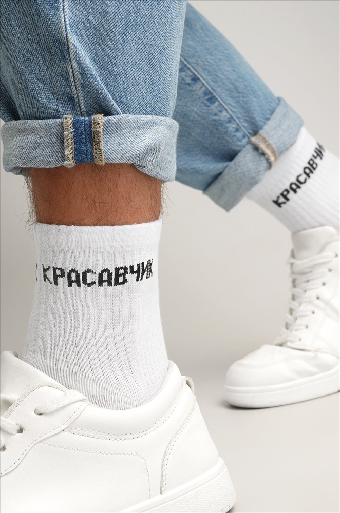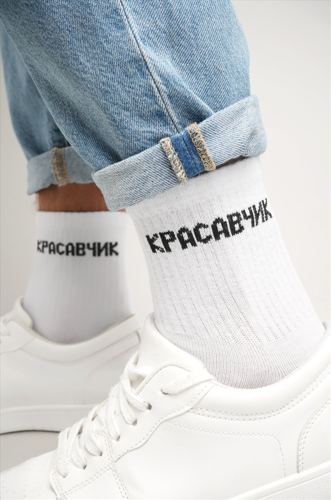 Добавь немного юмора и стиля в повседневный образ! Белые носки с прикольной надписью Красавчик для мужчин поднимут настроение тебе и окружающим.