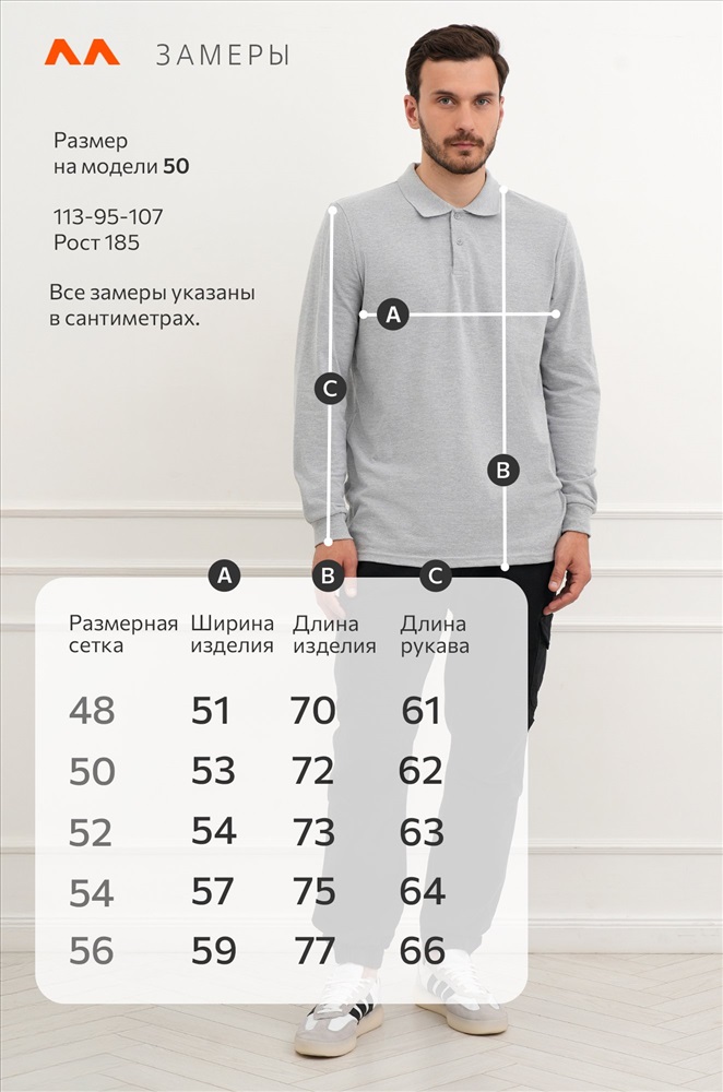 Рост модели 185 см, параметры: объем груди 113, объем талии 95, объем бедер 107. На нем размер 50.