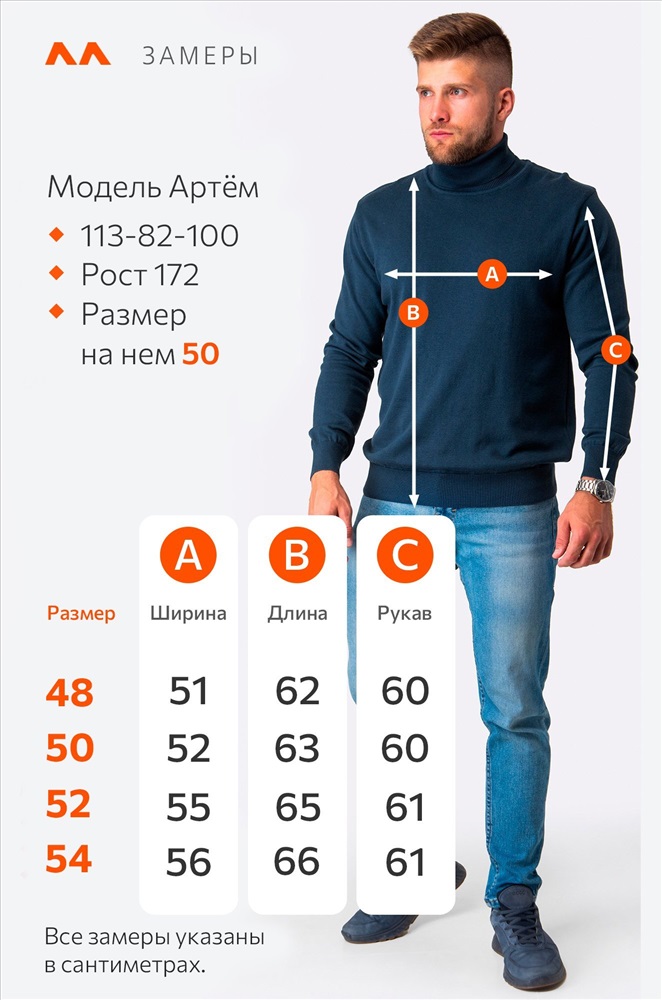 Модель Артем, его рост 172 см, параметры 113-82-100 см. На нем джемпер размера 50.