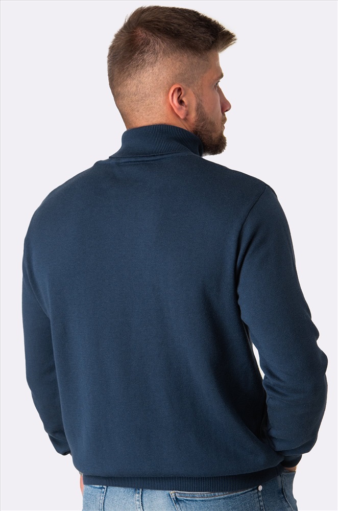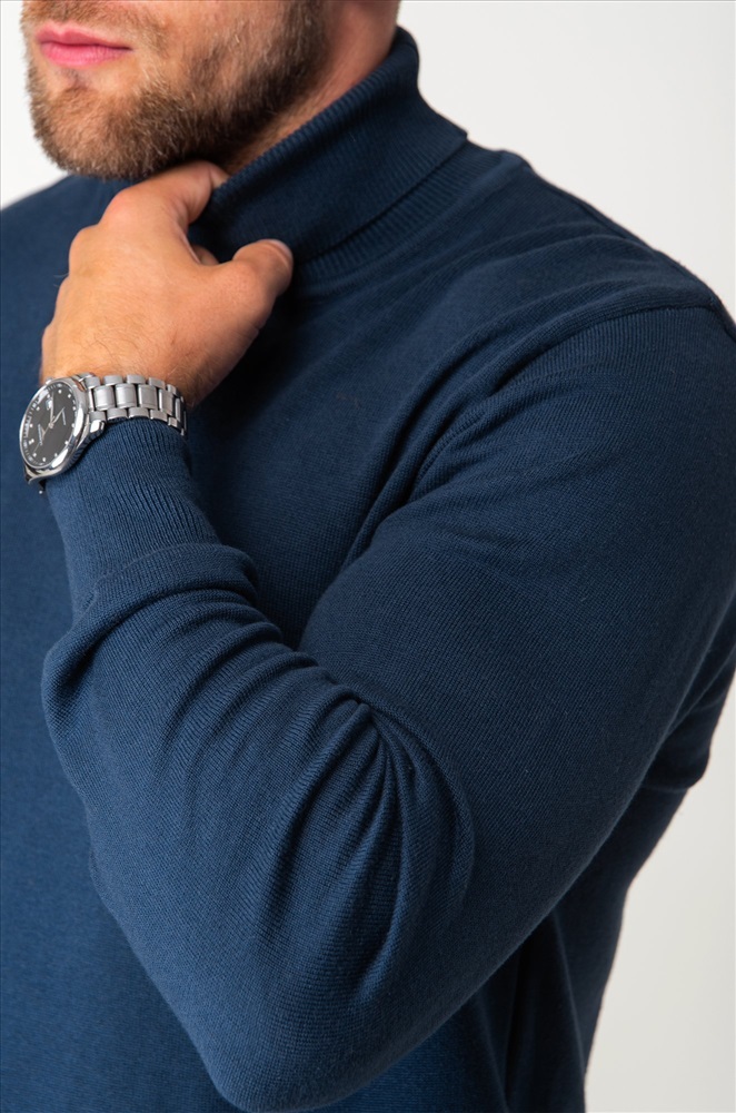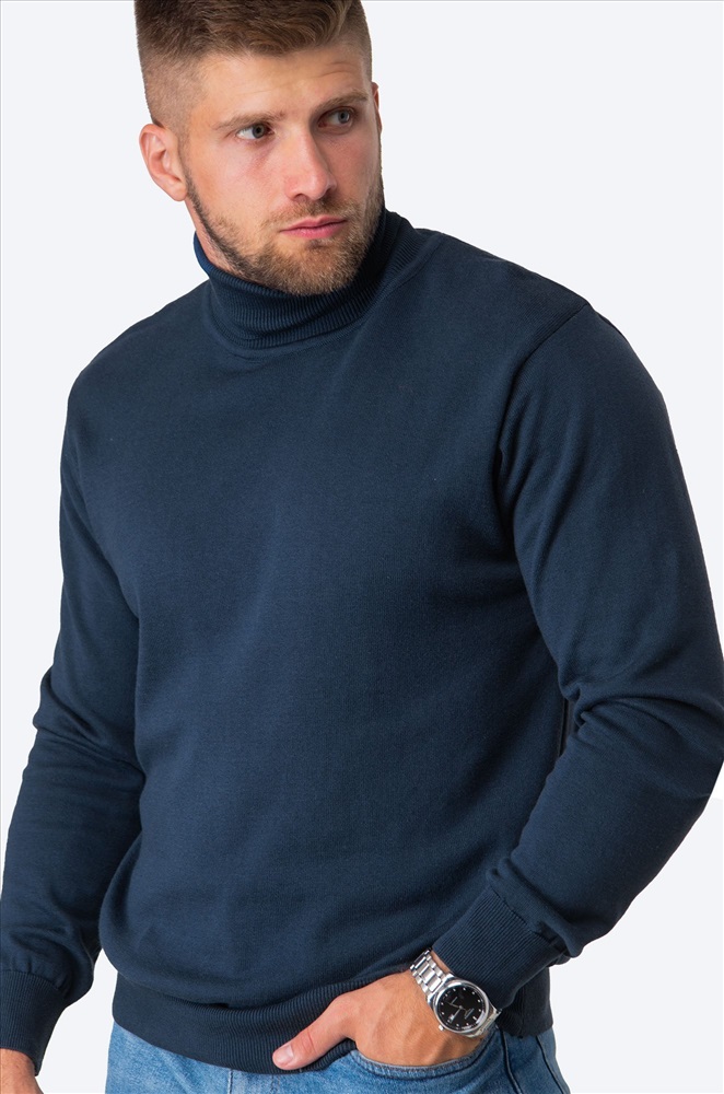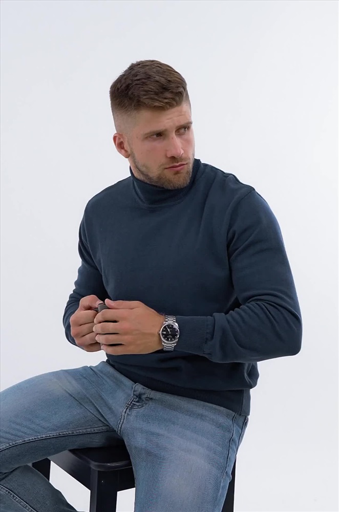 Синяя водолазка с высоким воротом для мужчин выполнена из вязаного трикотажа: в ней будет уютно и тепло в прохладную погоду. Хлопковый бадлон из мягкой пряжи с акрилом не колется, он невероятно мягкий и приятный к телу.