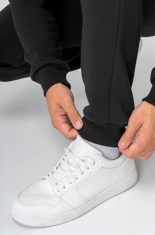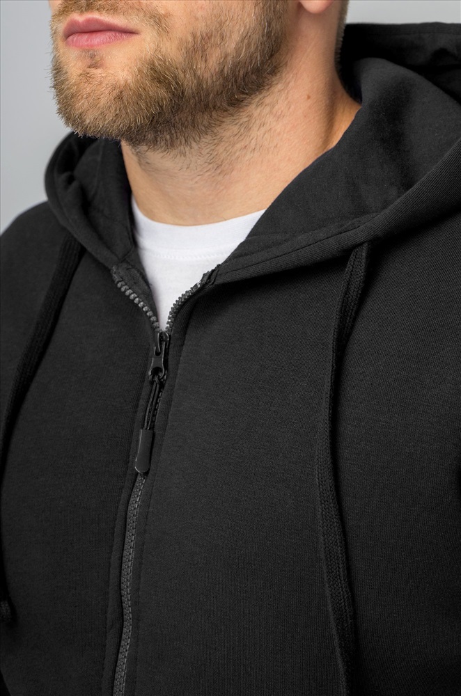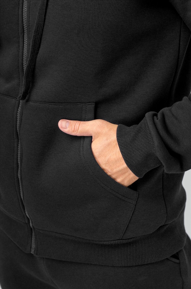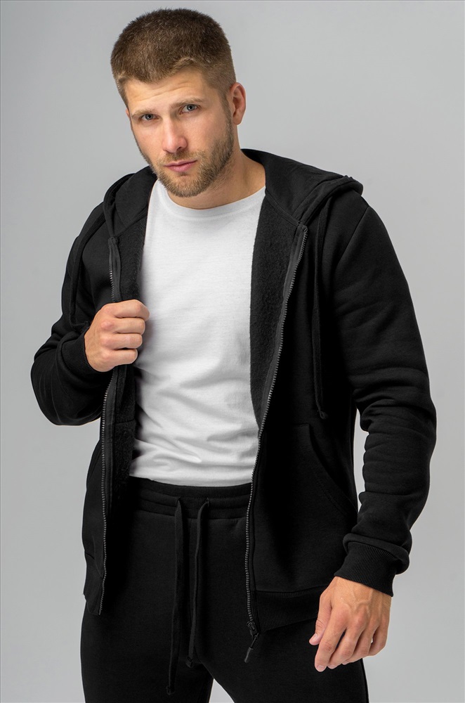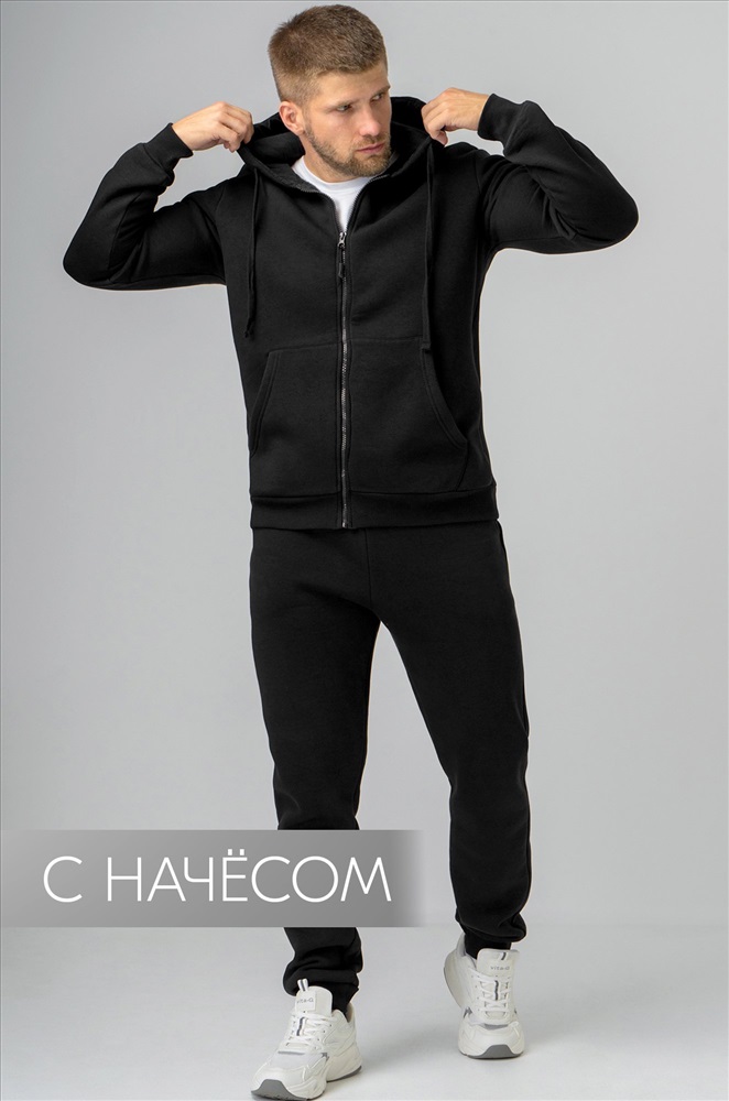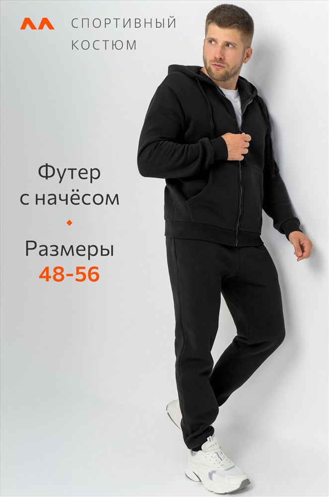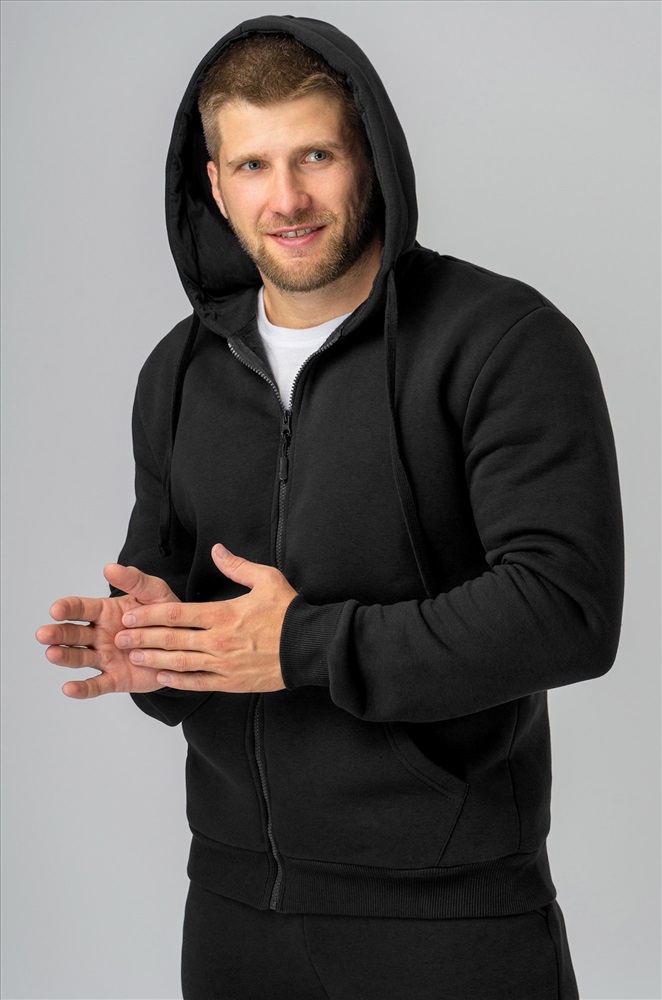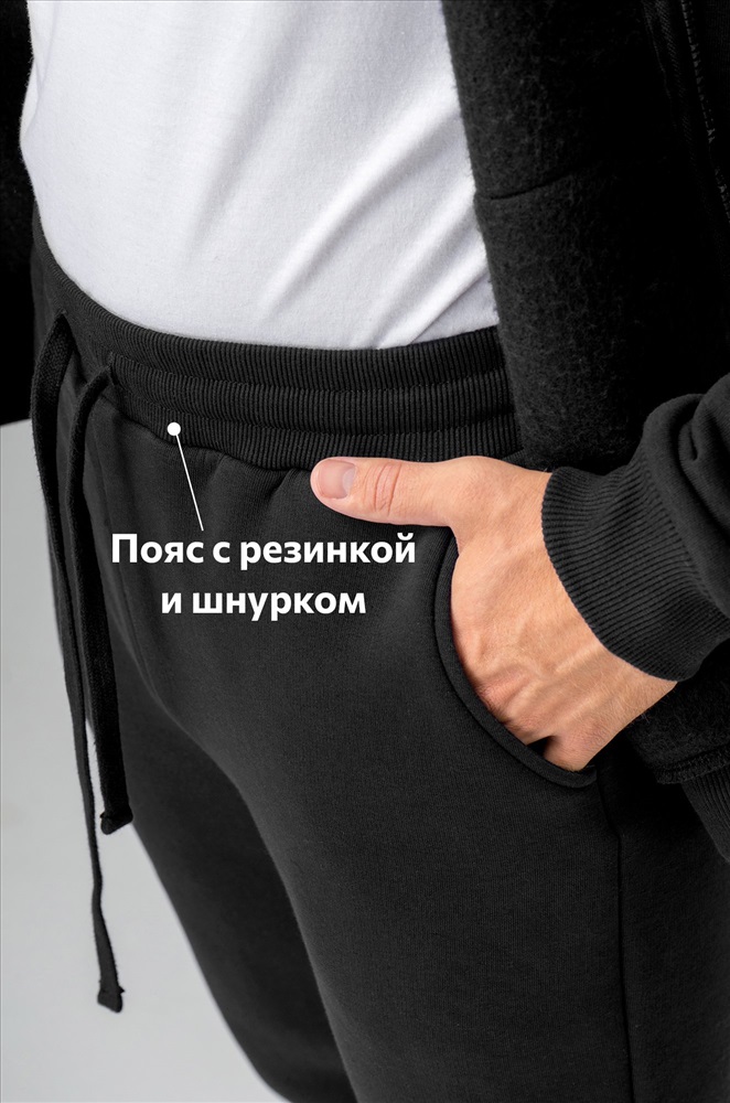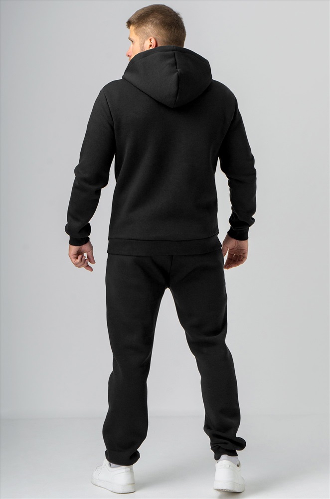 Теплый мужской костюм черного цвета выполнен из качественного трикотажа футер с начесом. В комплекте толстовка с регулируемым капюшоном и брюки джоггеры.