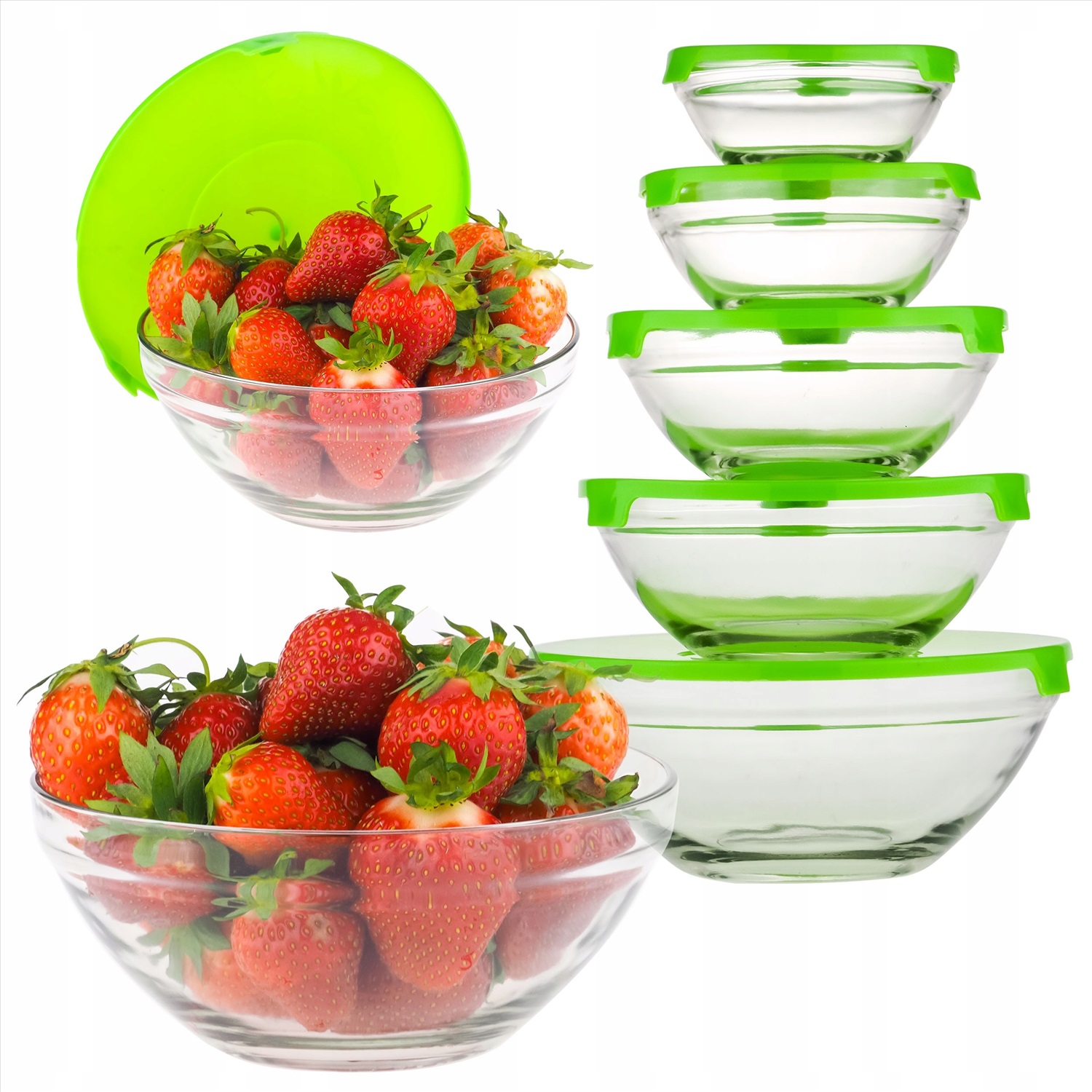 Набор из 5 стеклянных мисок с крышками Материал: стекло (специальное бытовое), полипропилен. Толщина стекла: 2-3 мм размеры: диа 9см (150мл), диа 10,5см (210мл), диа 12,5см (360мл), диа 14см (510мл), диа 17см (920мл) Крышки из пластмассы. Предназначены для хранения продуктов, приготовления пищи и сервировки стола. Миски компактно складываются одна в другую и занимают абсолютный минимум места — где бы они ни хранились. Упаковка: термоусадка + цветная коробка.
