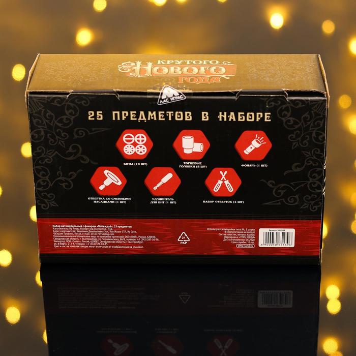Габариты: 20,3 x 13,4 x 10,5 см; Страна: Китай; В боксе: 20 набор; Состав: Металл, пластик; Материалы: металл, пластик; Фасовка: по 1 набор; Индивидуальная упаковка: Подарочная коробка; Размер упаковки: 20 см × 13 см × 10 см; Сертификат: Не подлежит сертификации; Набор: Да; Для кого: Для мужчины, Для мальчика; В наборе, шт.: 25; Количество предметов в наборе: 25; Тематика праздника: 23 Февраля, Новый год; Адресат: Главе семьи, Автомобилисту, Мужу; Типоразмер батареек: AA; Составляющие набора: Инструменты