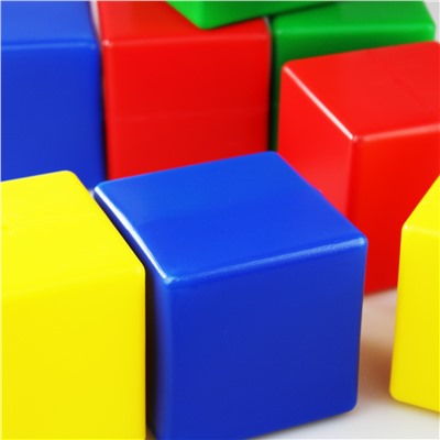 Детский строительный набор 12 кубиков из выдувного пластика, четыре основных цвета (красный, синий, желтый, зеленый). Размер грани 8 сантиметров. Для детей от 3 до 5 лет.