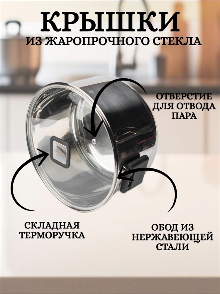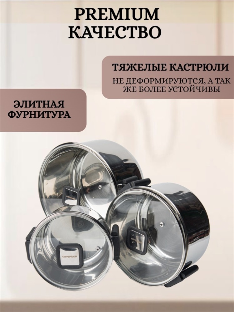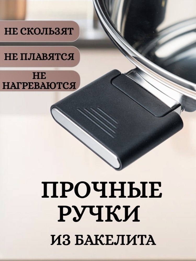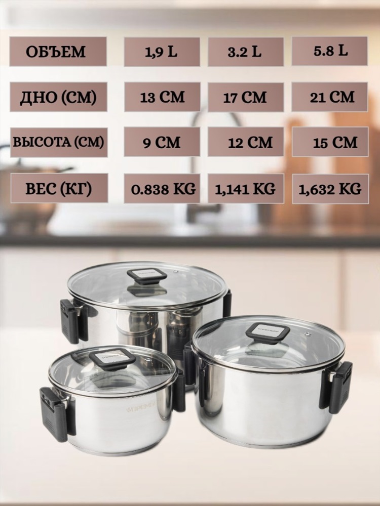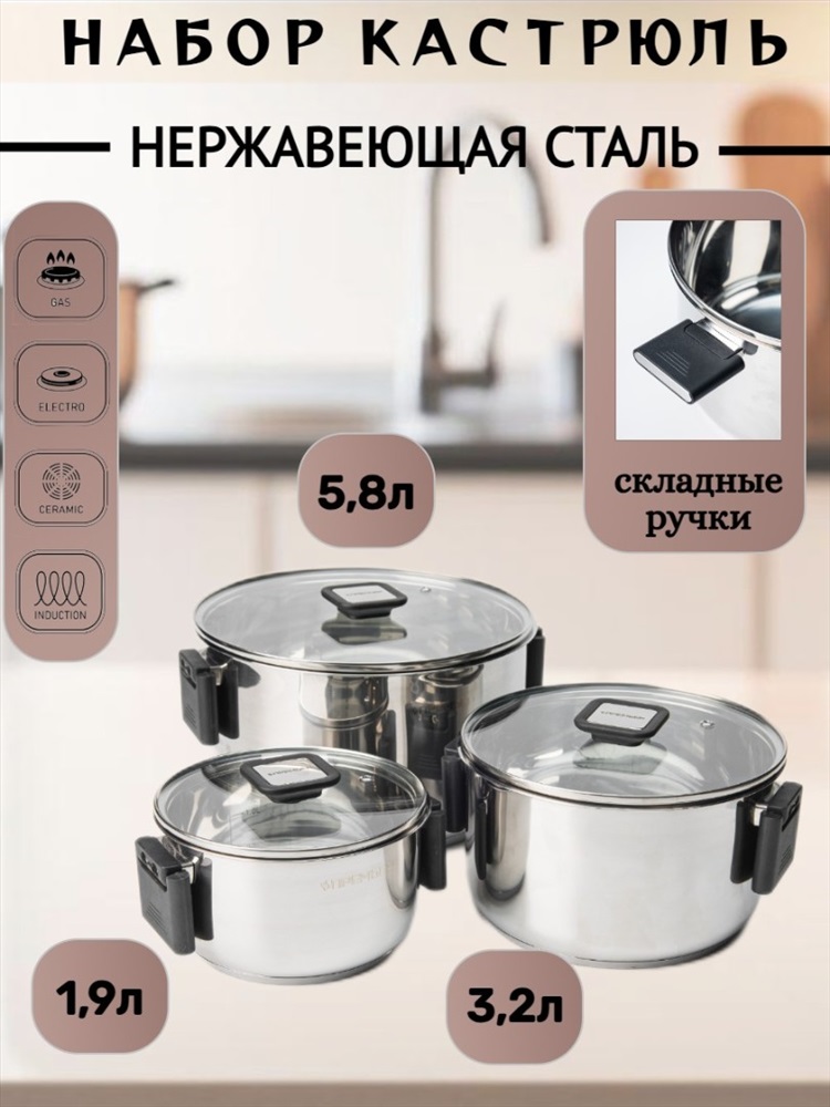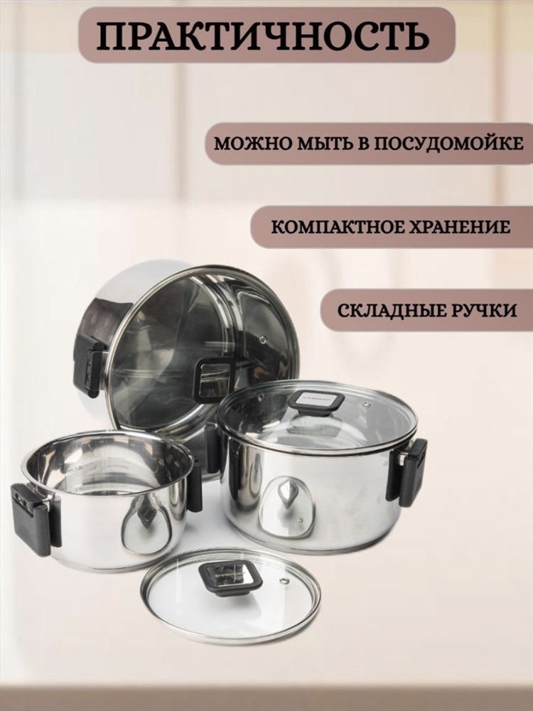Набор кухонной посуды из 6 предметов 1) материал: нержавеющая сталь № 201 2) толщина корпуса: 0,4 мм 3) дно: алюминий толщиной 0,5 мм + железо толщиной 1,0 мм + алюминий толщиной 0,5 мм. 3) бакелитовые складные ручки и эластичный набалдашник. Удобнее в использовании и экономит место. 4) корпус отполирован изнутри и снаружи до зеркального блеска. 4) можно мыть в посудомоечной машине Кастрюля с крышкой ø16*9 см 1,6 л Кастрюля с крышкой ø20*11,5 см 3,2 л Кастрюля с крышкой ø24*14 см 5,8 л Комментарии к товару