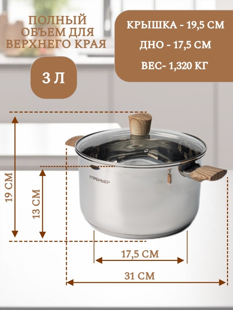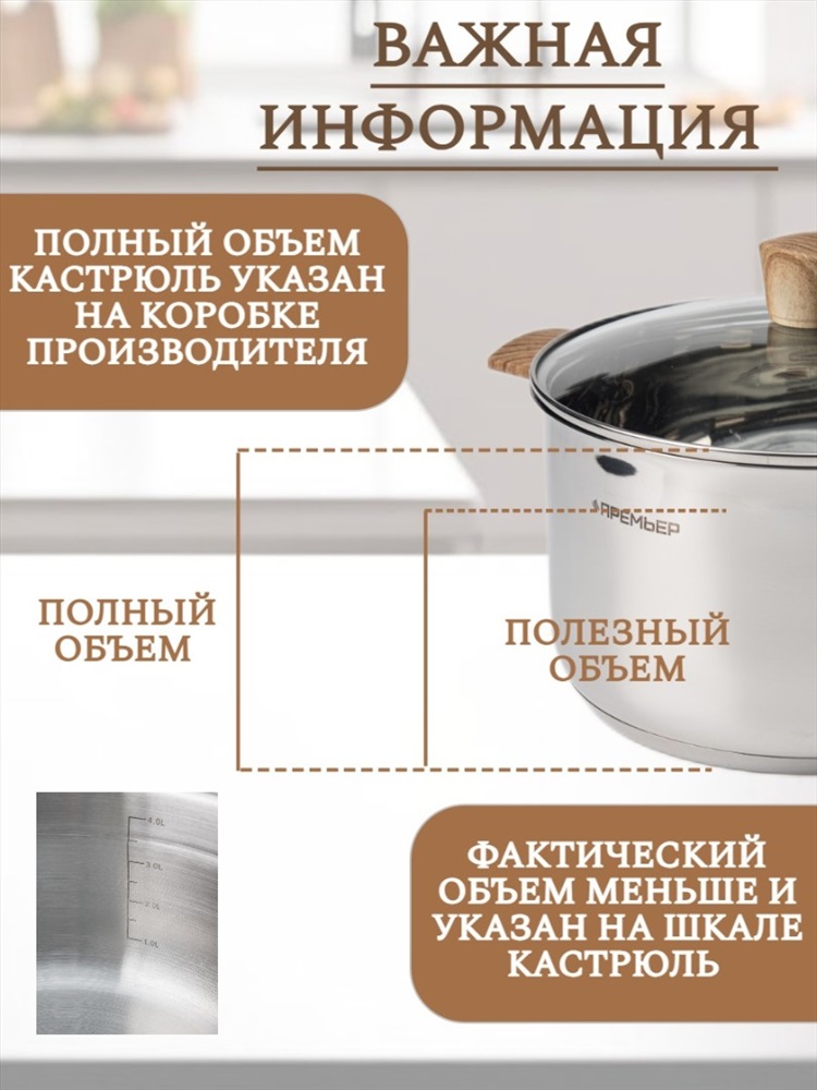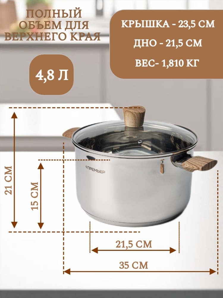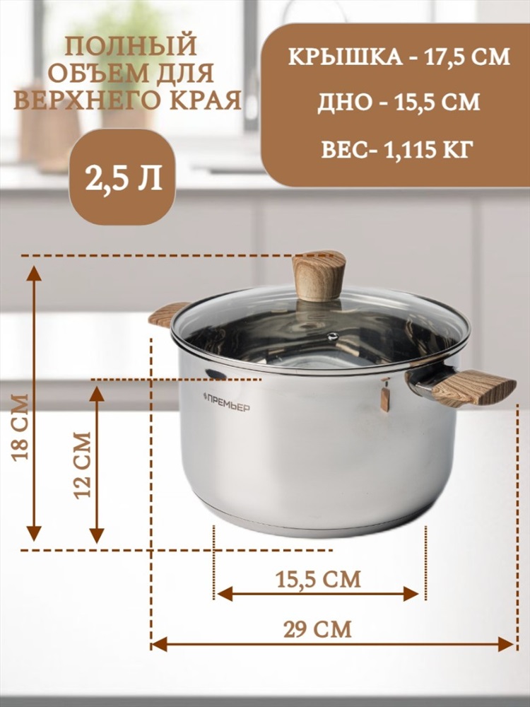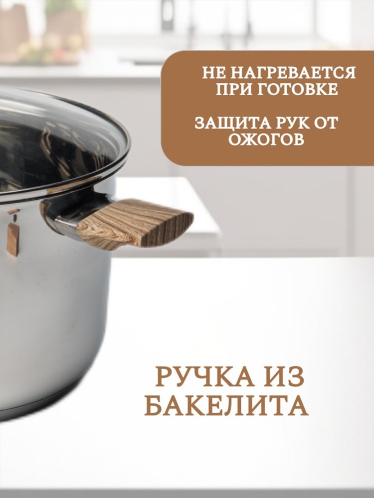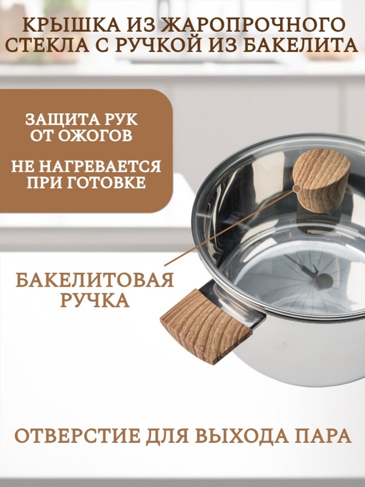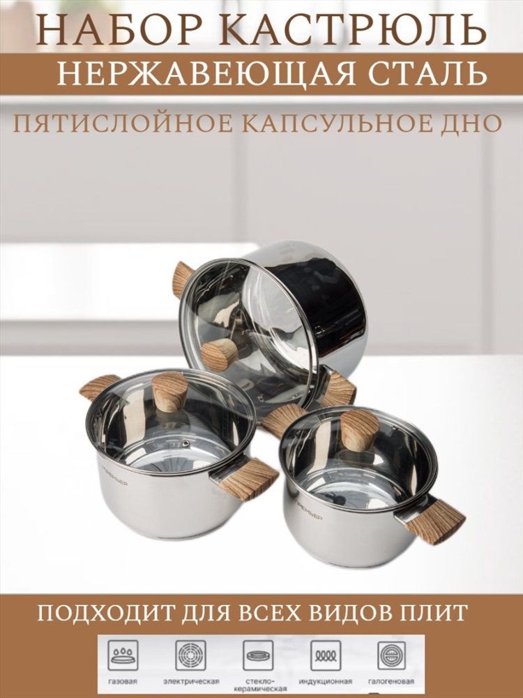 Набор кухонной посуды из 6 предметов 1) материал: нержавеющая сталь № 201 2) толщина корпуса: 0,5 мм; толщина дна: 0,5 мм алюминия + 1,5 мм чугуна + 0,5 мм алюминия 3) бакелитовые ручки и набалдашник с деревянным покрытием. 4) корпус отполирован изнутри и снаружи до зеркального блеска. 5) можно мыть в посудомоечной машине Кастрюля с крышкой ø18*11,5 см 2,5 л Кастрюля с крышкойø20*12,5 см 3 л Кастрюля с крышкой ø24*14,5 см 4.8 л