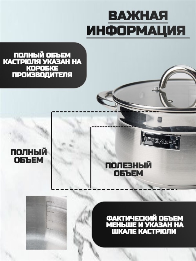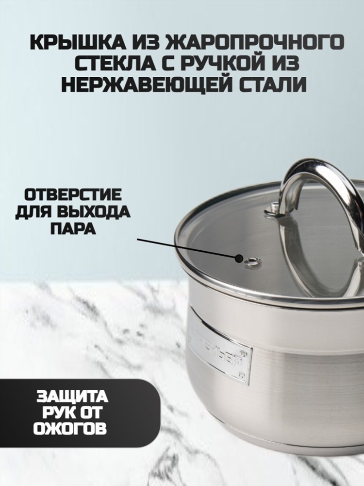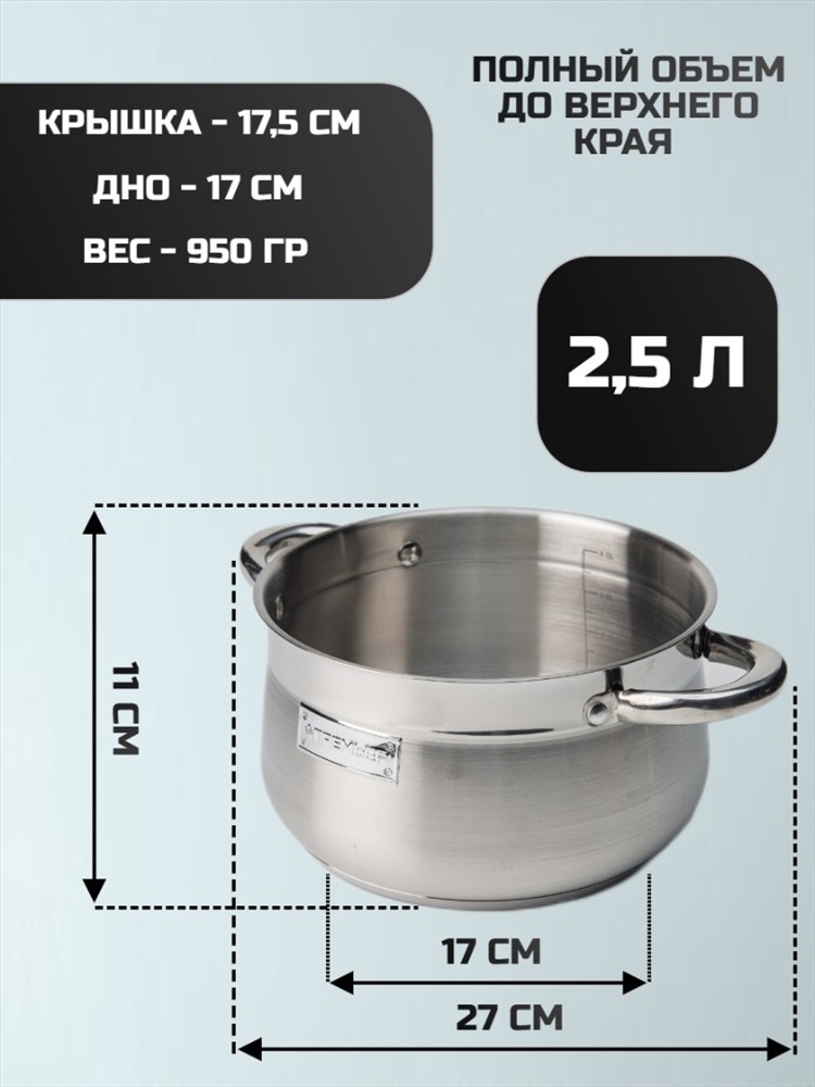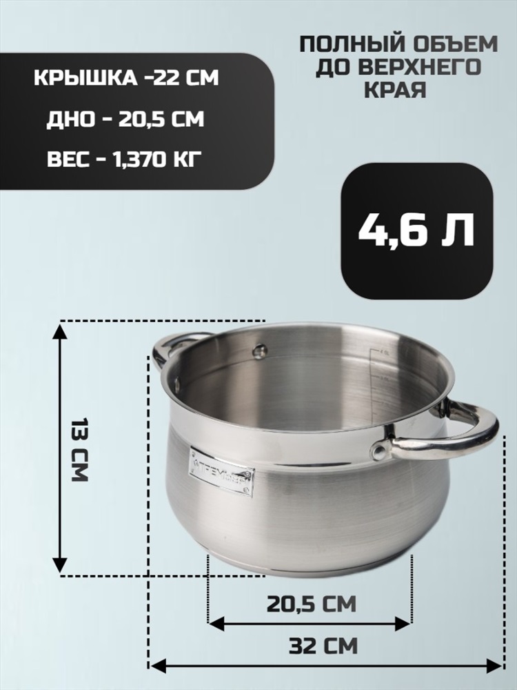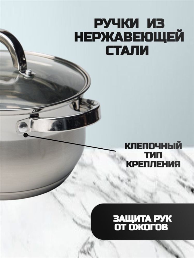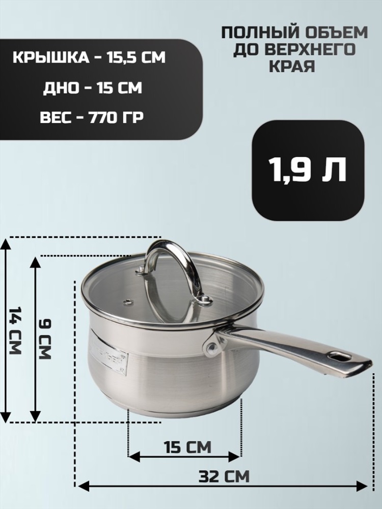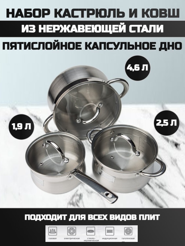 Набор кухонной посуды из 6 предметов 1) материал: нержавеющая сталь № 201 2) толщина корпуса: 0,5 мм 3) дно: 0,5 мм алюминиевое + 1,5 мм чугунное + 0,5 мм алюминиевое + дно – нержавеющая сталь № 430 3) крышка фильтра т-образной формы, ручка с силиконовой заклепкой 4) корпус внутри и снаружи отполирован до зеркального блеска 5) можно мыть в посудомоечной машине Ковш с крышкой ø16*9.5 см 1,9 л Кастрюля с крышкой ø18*10,5 см 2,5 л Кастрюля с крышкой ø22*12,5 см 4.6 л Комментарии к товару
