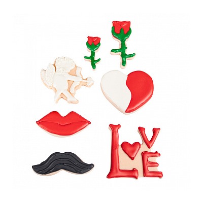 • Размеры: сердце - 71*63 мм; роза мал. - 55*27 мм; роза - 80*38 мм; губы - 70*34 мм; усы - 76*27 мм; амур - 71*60 мм; love - 65*66 мм.