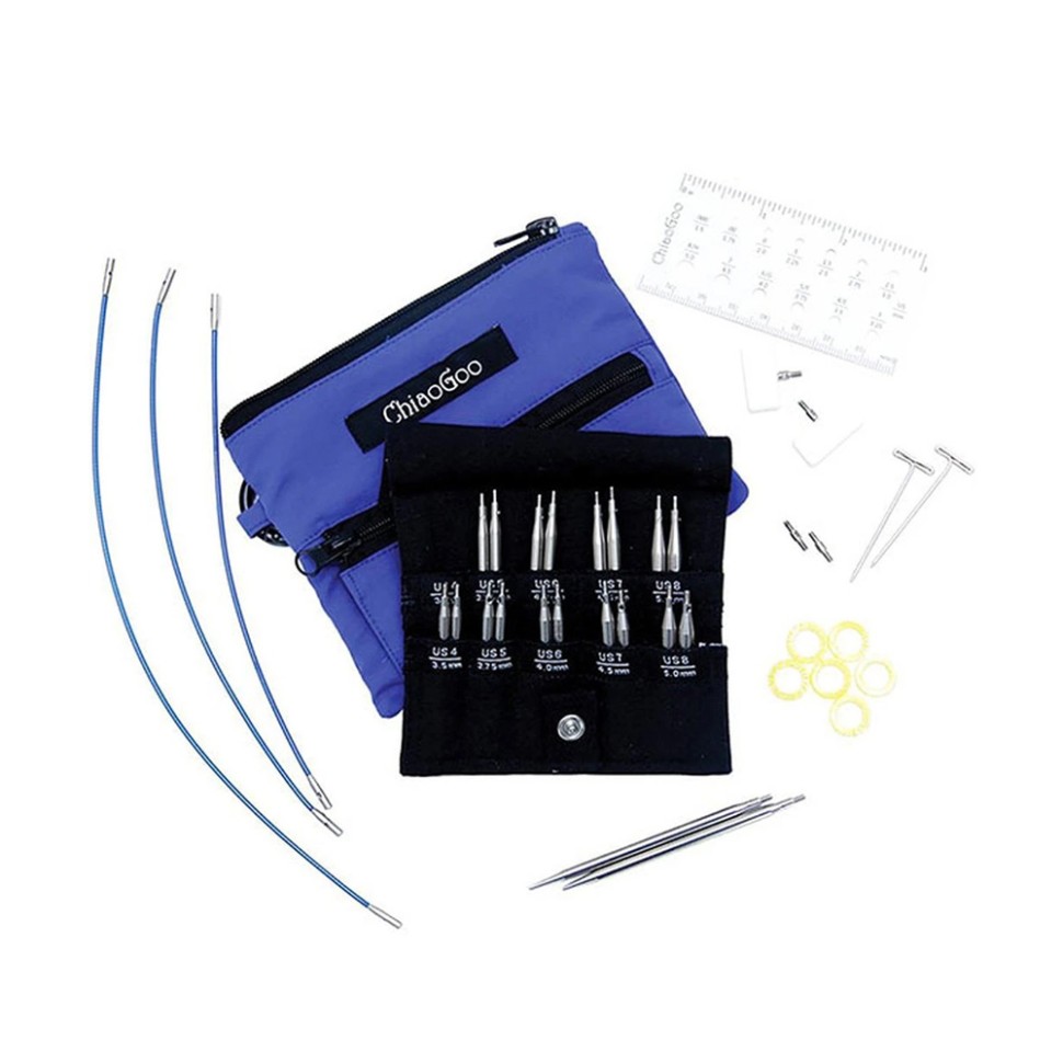 2 коннектора лесок, 2 концевых ограничителя (стопперы), 2 ключа, 6 маркеров петель, линейка для определения размера спиц, резиновый захват в форме сердечка для удобства соединения спицы с леской.