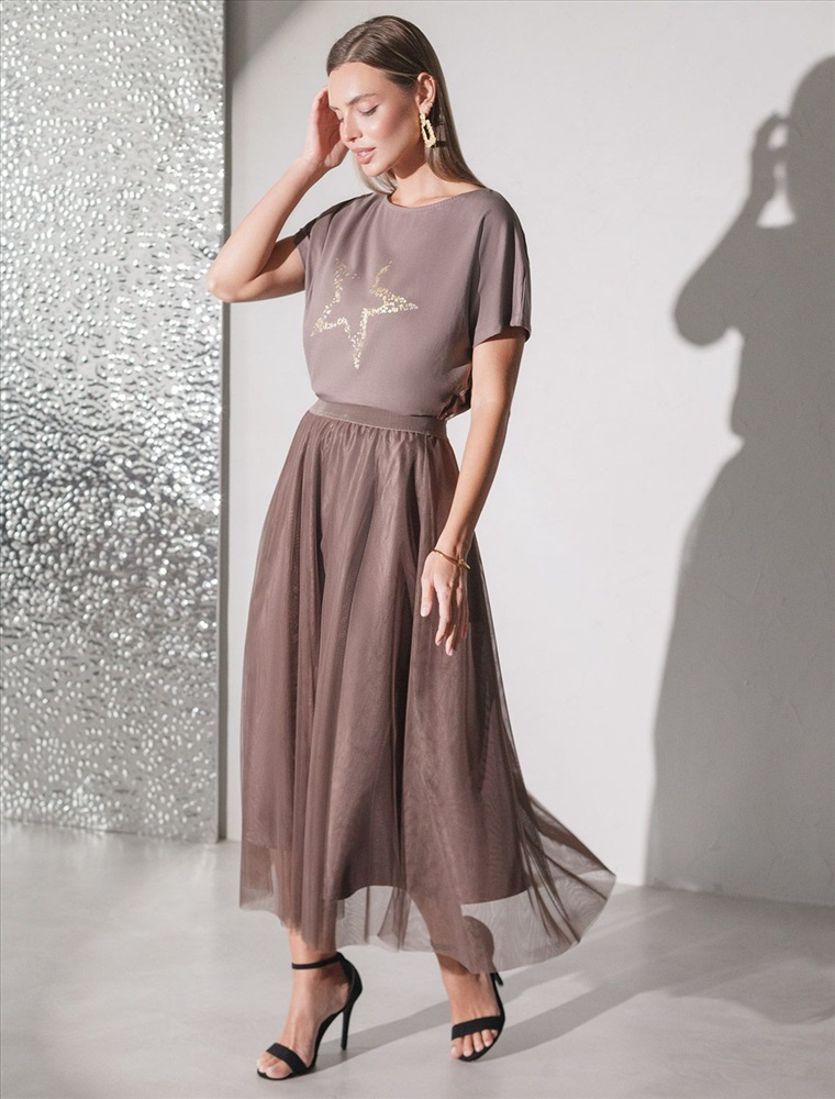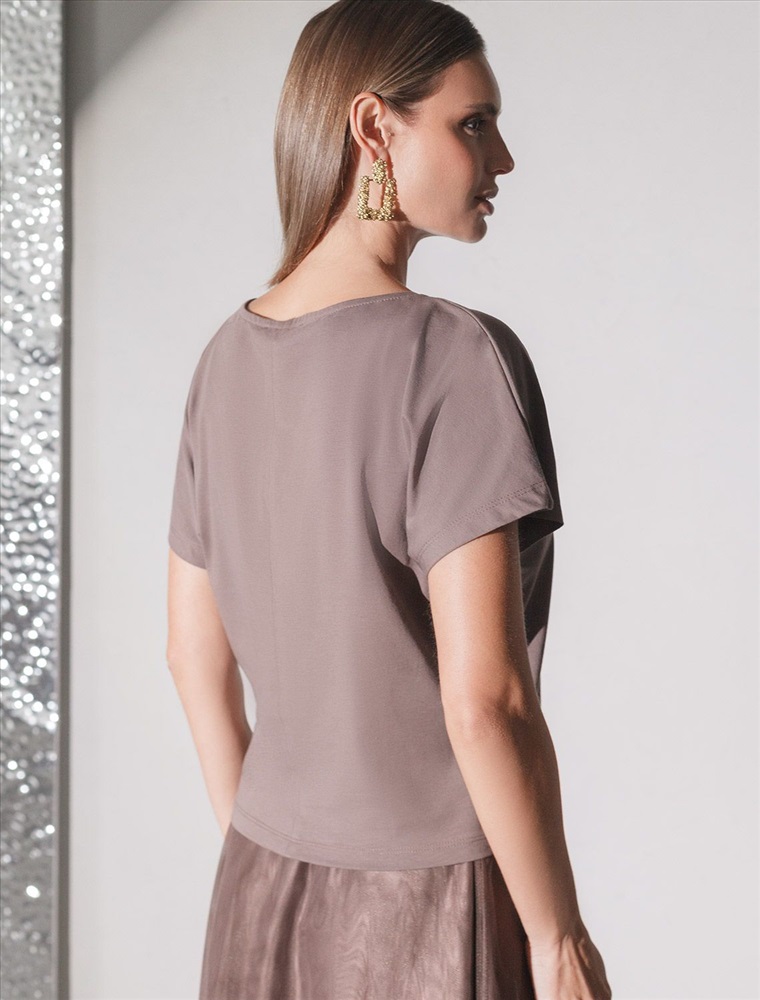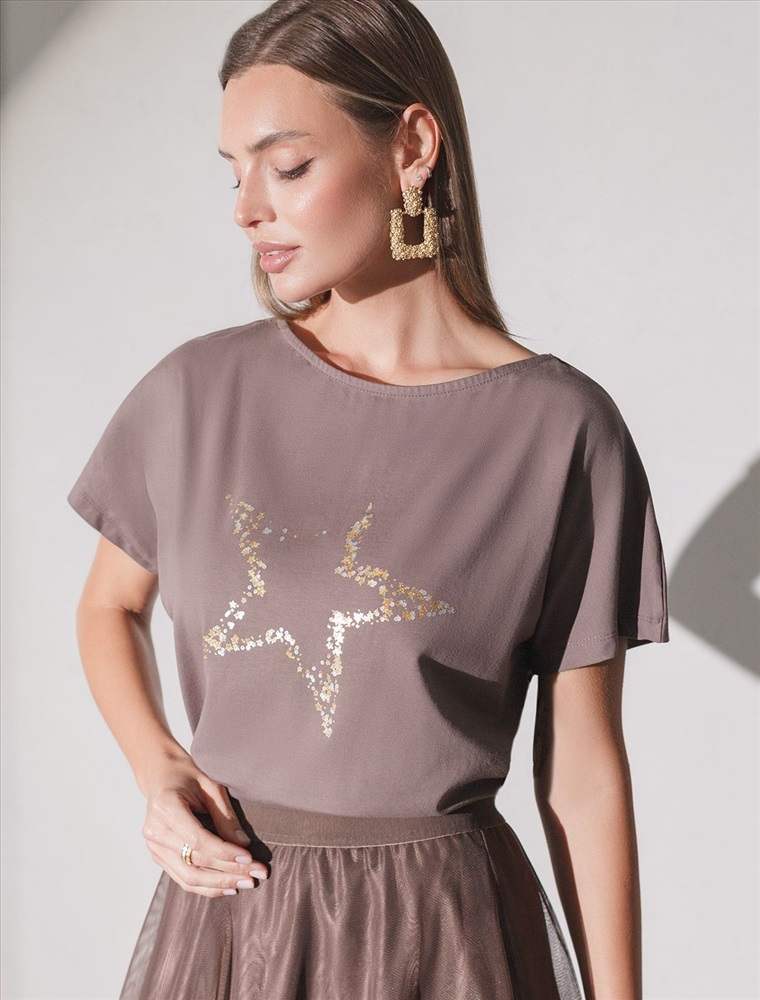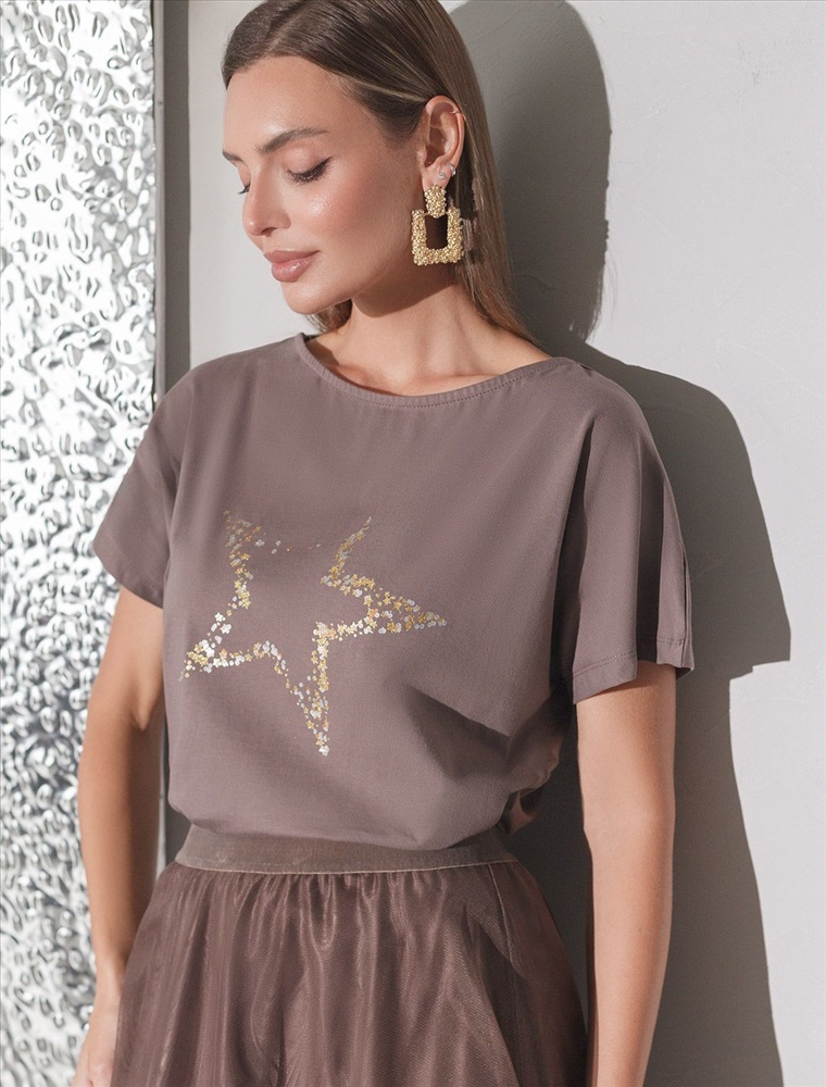 Плотность: 150 Г/м2 Футболка кофейного цвета идеально подходит для вечеринки и создания яркого образа. Оригинальный принт из блестящей фольги в виде звезды придает изделию шикарный вид, который привлечет внимание на любом мероприятии. Модель с вырезом лодочка и цельнокроеным рукавом обеспечивает свободу движений и комфорт в носке. Такой фасон изделия подходит на большие размеры, гармонично сидит на фигуре и помогает создать легкий акцент на достоинствах. Благодаря особенностям кроя с цельнокроеным рукавом удается искусно скроет любые возможные недостатки в области плеч и рук, обеспечивая комфортное прилегание без ощущения скованности. Аккуратный вырез лодочка красиво подчеркивает шею и делает образ элегантным, сохраняя актуальность для разных случаев — от рабочих встреч до вечерних прогулок и праздничных мероприятий. Модель изготовлена из премиального хлопка с добавлением эластана. Добавление эластана в состав изделия способствует формоустойчивости. Эта нарядная футболка подходит для создания образа на каждый день и идеально подойдет на выход. Модель не мнется, что делает ее практичным вариантом для активных женщин, которые ценят стиль и удобство. Женская футболка подчеркнет вашу индивидуальность и позволит вам выглядеть привлекательно в любой ситуации. Легкость в уходе и высокая износостойкость делают ее незаменимой вещью в вашем гардеробе. Благодаря сочному дизайну и качественной отделке, футболка легко сочетается с различными элементами гардероба, позволяя создавать уникальные комплекты для разных случаев. Она станет ярким акцентом в вашем гардеробе и подарит уверенность на любом событии. Такой вариант одежды станет отличной базой для стильного и эффектного образа на праздничное событие, корпоратив, Новый Год. Комментарии к товару